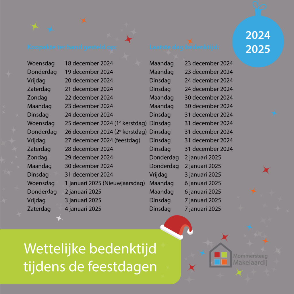 De wettelijke bedenktijd begint vanaf het moment dat de koper een exemplaar van de door beide partijen getekende koopovereenkomst heeft ontvangen. De bedenktijd duurt minimaal drie kalenderdagen, waarvan ten minste twee werkdagen en wordt verlengd als deze eindigt in het weekend of op een algemeen erkende feestdag. De bedenktijd eindigt om 24:00 uur op de laatste dag van de bedenktijd. Maar de bedenktijd rond de feestdagen ziet er net even anders uit.