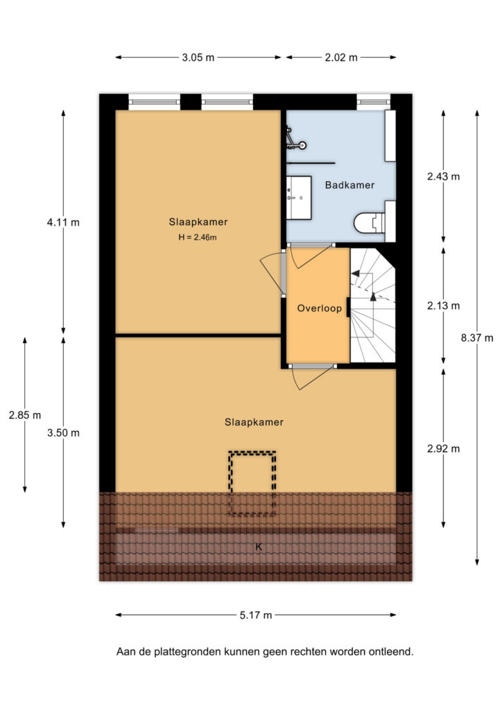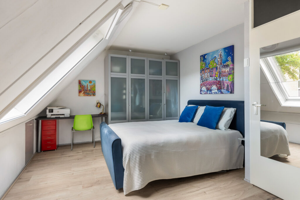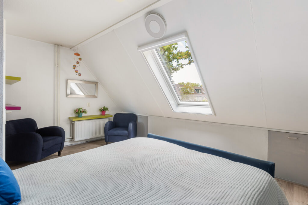 De slaapkamer aan de voorzijde is voorzien van een groot Velux dakraam met raambekleding en een hor (ca. 17m²). De slaapkamer aan de achterzijde (ca. 13m²) is voorzien van een grote raampartij met een hor.