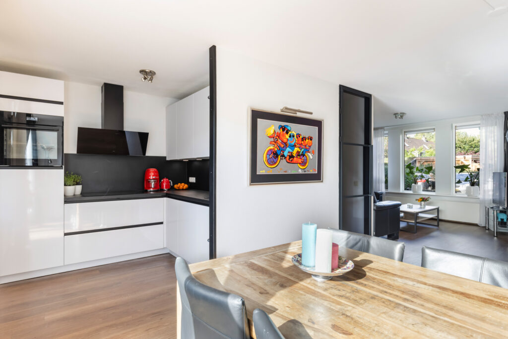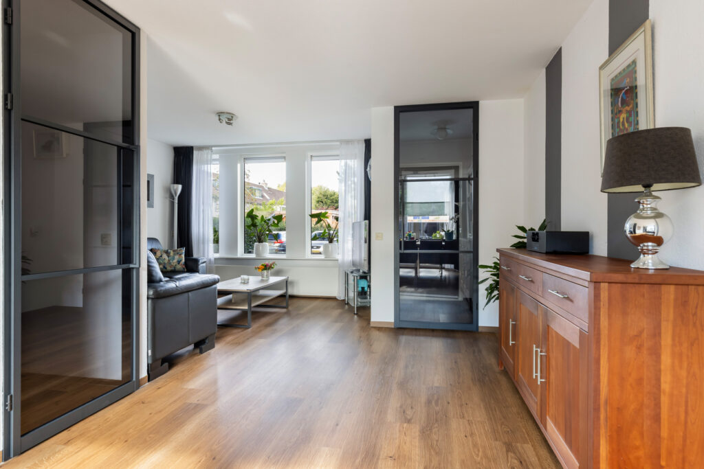 De lichte woonkamer (ca. 30m²) heeft aan zowel de voor- als achterzijde grote raampartijen, waardoor je geniet van veel natuurlijk licht en een prachtig uitzicht op de tuin. De stijlvolle Gewoon Gers deuren geven de ruimte een moderne uitstraling. Daarnaast is de woonkamer aan beide zijden voorzien van zonwering (zowel elektrisch als handbediend). Via de kunststof schuifdeuren (met kantelkiep functie) aan de achterzijde stap je zo de zonnige achtertuin in, wat zorgt voor een fijne verbinding tussen binnen en buiten.