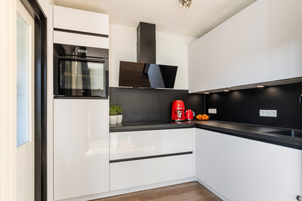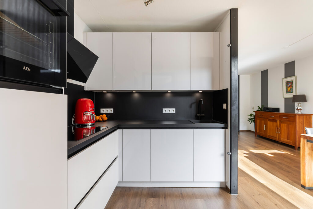 De moderne witte hoogglans keuken (ca. 5m²), vernieuwd in 2022 (Brugman), straalt luxe en frisheid uit. Het stijlvolle werkblad met zwarte rvs-spoelbak en bijpassende kraan vormt een mooi geheel. De keuken is compleet uitgerust met hoogwaardige inbouwapparatuur van AEG, waaronder een 4-pits inductiekookplaat, een moderne glazen afzuigkap, een ruime heteluchtoven, een vaatwasser en een koelkast. Kortom: een keuken die zowel praktisch als smaakvol is ingericht, perfect voor de kookliefhebber!