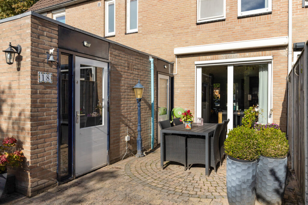 De zonnige en beschutte achtertuin, gelegen op het zuidoosten, is een heerlijke plek om te ontspannen. De tuin is voorzien van een groot zonneterras en wordt omringd door een houten schutting en groen. Praktisch zijn ook de buitenkraan, verlichting en de handige achterom. De twee boompjes bieden veel schaduw en lenen zich perfect voor een hangmat. De ideale plek om te genieten van het zomerse buitenleven.