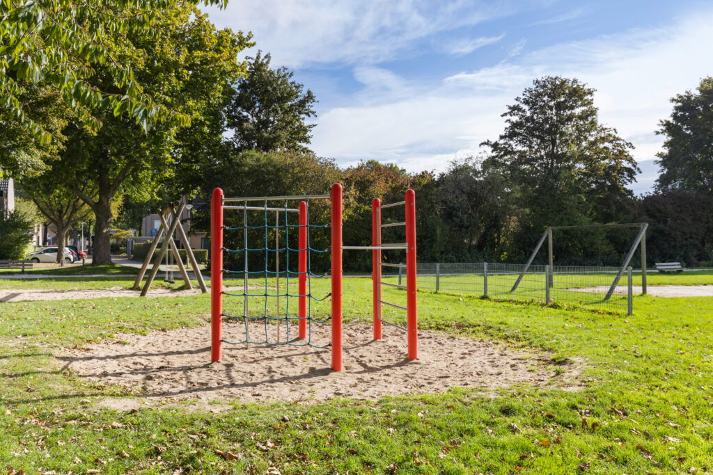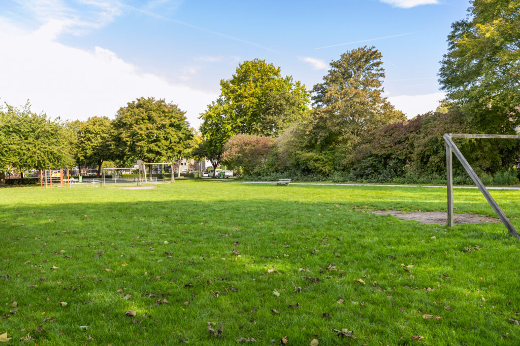 – Vrij uitzicht over een groene en boomrijke speelweide.