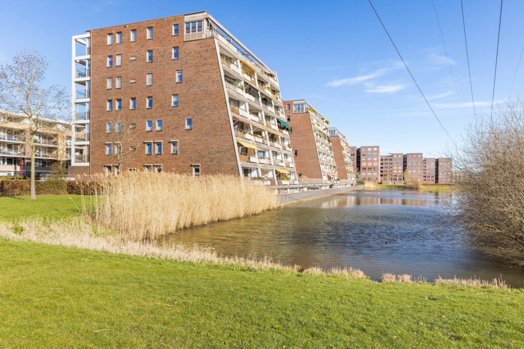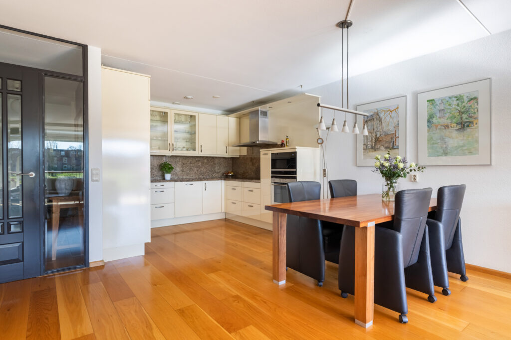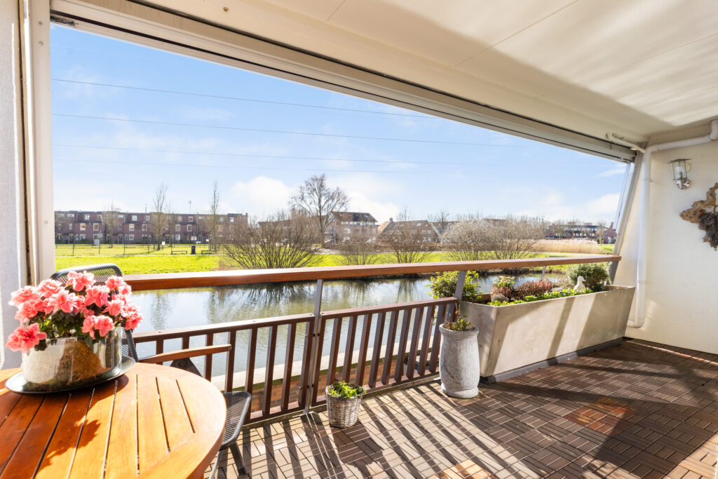 De ruime en lichte woonkamer met open keuken bevindt zich op de begane grond en biedt een prachtig vrij uitzicht over de waterpartij en de dierenweide. Aansluitend ligt een zonnig balkon op het zuiden.