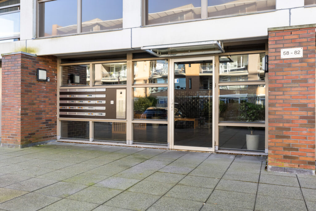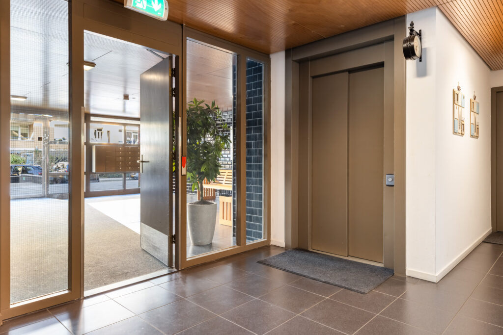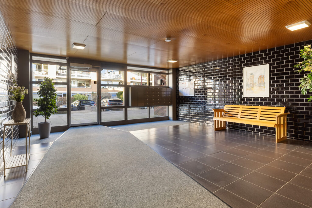 Afgesloten centrale hal met brievenbus en tweede hal met toegang tot de appartementen, lift en de onderbouw waar de genoemde gemeenschappelijke voorzieningen zich bevinden.