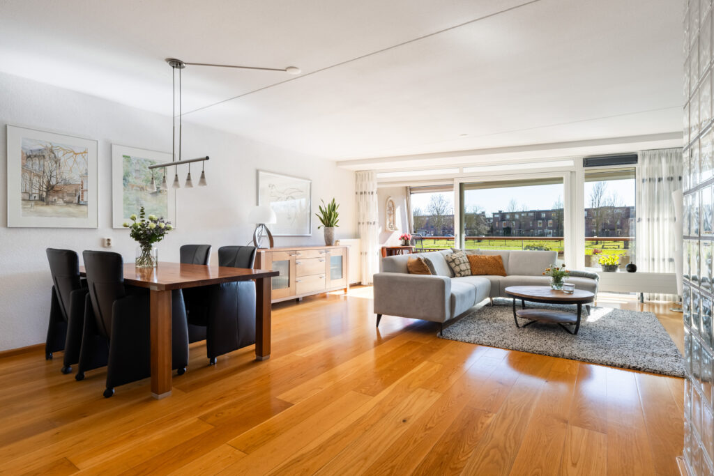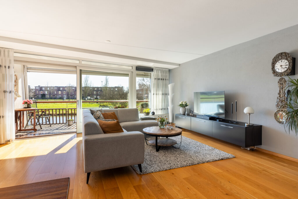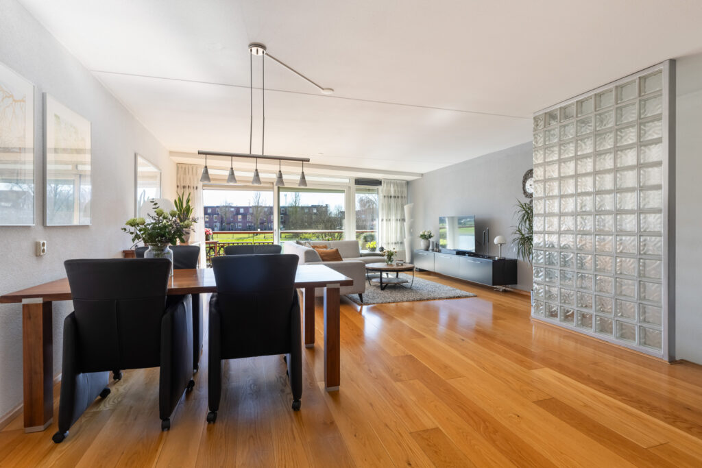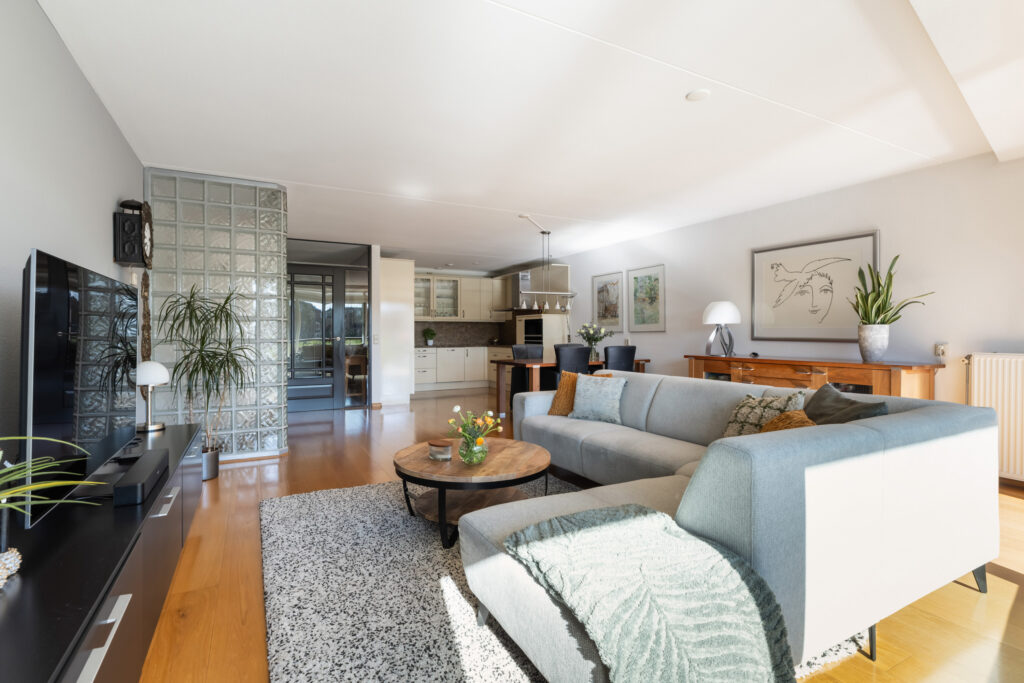 – Ruime en lichte woonkamer met glaswand over de volle breedte.