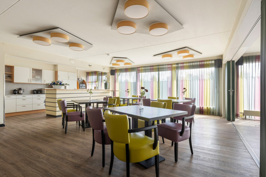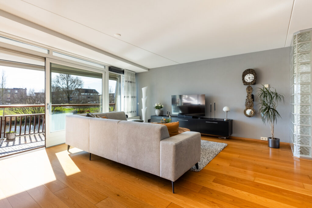 Vanuit de centrale hal met meterkast, toiletruimte, afgesloten garderobe en praktische berging (ca. 4m²) bereikt u de royale, zonnige woonkamer (ca. 50m²). De schuifpui geeft toegang tot het perfect op het zuiden gelegen balkon, voorzien van een elektrisch bedienbaar zonnescherm. Hier geniet u het hele jaar door comfortabel van de zon én het weidse uitzicht over de waterpartij en de dierenweide. Een heerlijke plek om volledig tot rust te komen.