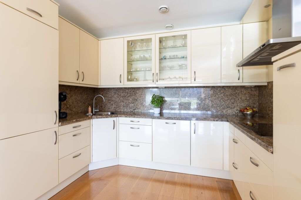 De lichte keuken is uitgevoerd met een granieten werkblad, volop kastruimte en sfeervolle inbouwspots. Verder beschikt de keuken over een dubbele RVS-spoelbak met afgietgedeelte en diverse inbouwapparatuur (allen van Siemens), waaronder een 4-pits keramische kookplaat, RVS-afzuigkap, magnetron en heteluchtoven, een vaatwasser (Bosch, 2024) en een koel-/vriescombinatie (Siemens). Deze verdieping is voorzien van lamelparket.