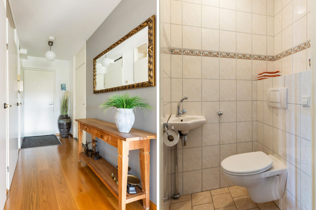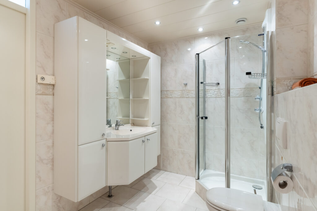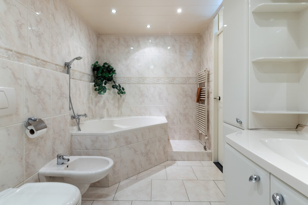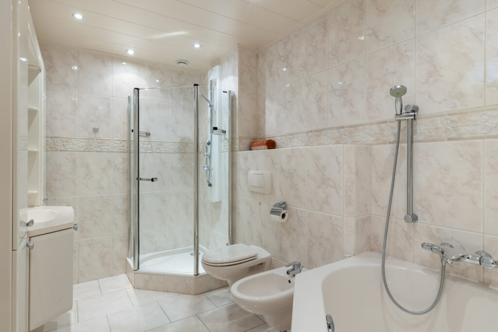 De badkamer (ca. 8m²) is royaal en compleet, met een douchecabine, ligbad, wastafelmeubel met spiegel en designverlichting, handdoeken radiator en een tweede toilet met bidet. Bovendien zorgt de elektrische vloerverwarming voor extra comfort, een heerlijke start van de dag.