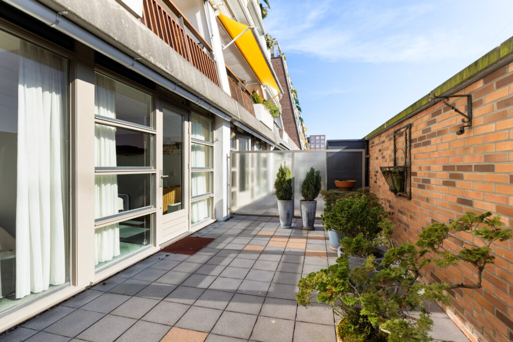 Op de onderliggende verdieping bevinden zich twee ruime slaapkamers en de badkamer. Vanuit één van de slaapkamers is het royale zonneterras bereikbaar. Met een balkon én een ruim terras op het zuiden beschikt dit appartement over een uitzonderlijk fijne buitenruimte op twee niveaus. Daarnaast is er zowel op de woon- als op de slaapverdieping een praktische berging aanwezig.