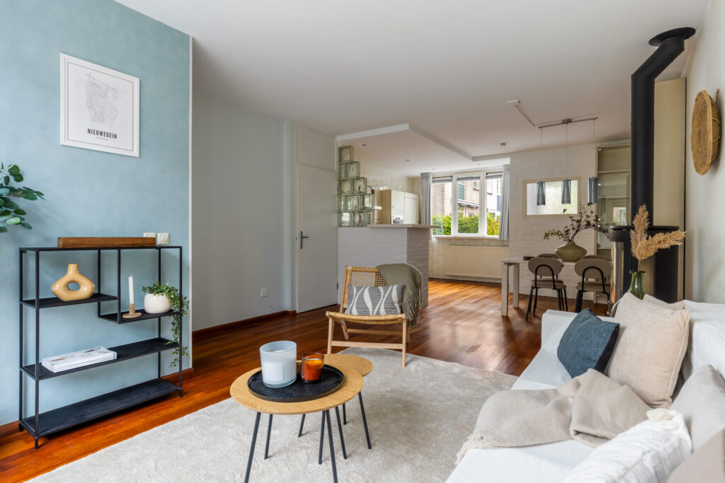 De ruime woonkamer (ca. 37m²) is aan de voor- en achterzijde voorzien van een grote moderne raampartij met uitzicht op de beschutte voor- en achtertuin. Hierdoor is het heerlijk licht en geniet je van veel privacy. Daarnaast is de woonkamer voorzien van een praktische trapkast met veel bergruimte en een sfeervolle design haard.
