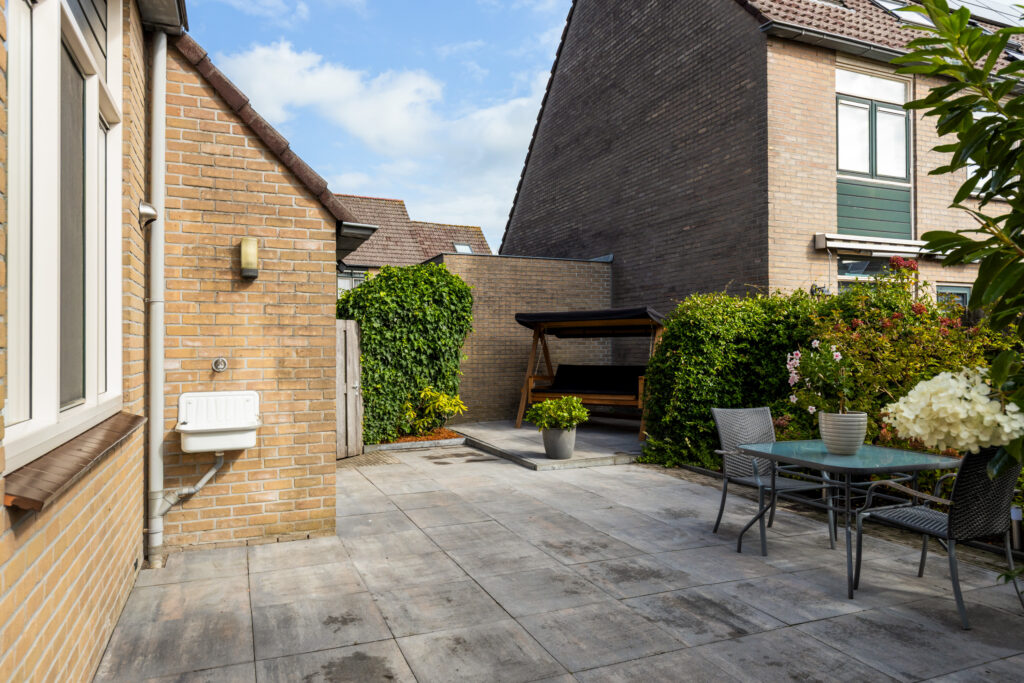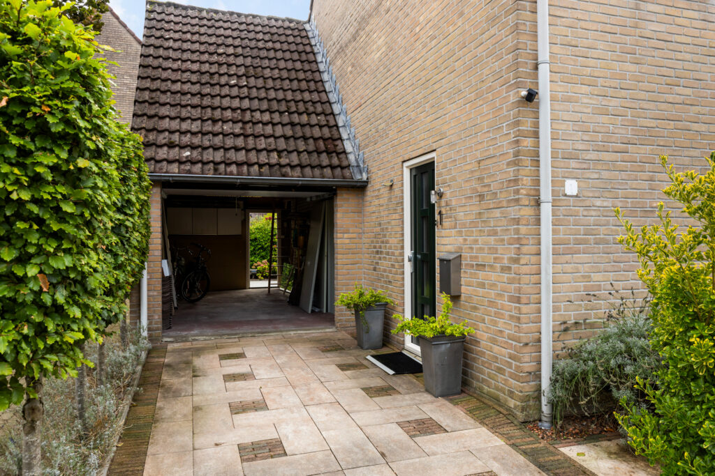 De tuin is smaakvol aangelegd met groene borders vol planten, bloemen en struiken, voorzien van sfeervolle buitenverlichting. Zowel aan de voor- als aan achterzijde is er een waterkraan waarbij aan de achterzijde een wasbak aanwezig is. Daarnaast is er toegang tot de garage én een achterom, waardoor de tuin goed bereikbaar is.