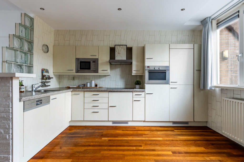 Aan de achterzijde van de woning bevindt zich de open keuken (ca. 9m²), deze is voorzien van een kunststof werkblad, inbouwspots aan het plafond en diverse inbouwapparatuur; (Bosch), vaatwasser (Siemens), 4-pits inductie kookplaat (Scholtes), rvs-afzuigkap (Siemens), oven (Siemens), magnetron (Siemens) en rvs-spoelbak met afgietgedeelte. Verder beschikt de keuken over voldoende bergruimte in de kasten en lades.