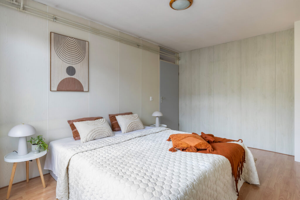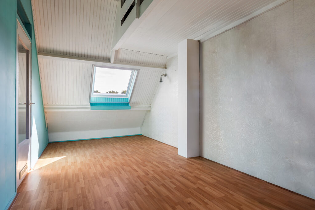 De vierde slaapkamer (ca. 20m²) voelt dankzij de hoge nok heerlijk ruimtelijk aan en is voorzien van twee Velux-dakramen met horren, waardoor er veel daglicht binnenkomt. De praktische bergvliering is bereikbaar via een verwijderbare houten trap.