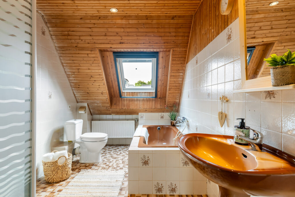 De ruime en geheel betegelde badkamer is uitgerust met een douchecabine, wastafel met spiegel, ligbad, toilet, radiator en een Velux dakraam met hor.