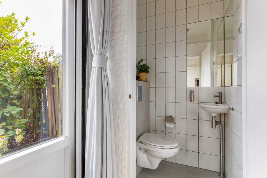 Via de tussenhal heb je toegang tot het moderne toilet met fontein en nieuwe kunststof deur die toegang biedt tot de achtertuin.