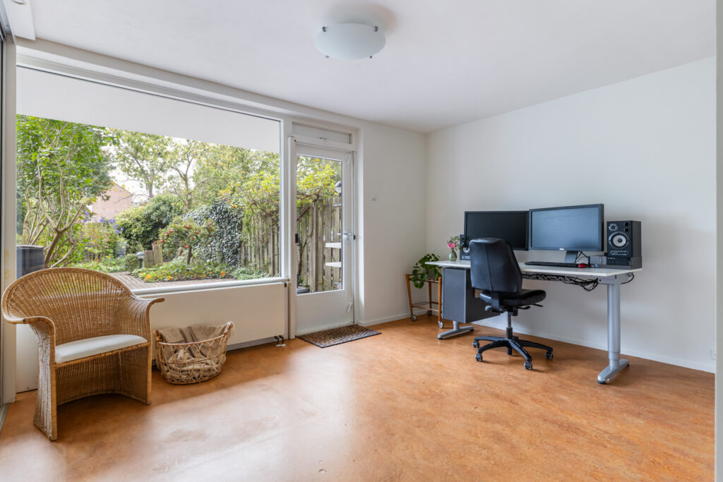 De lichte tuinkamer (ca. 17m²) is aan de achterzijde gesitueerd en voorzien van een kamerbrede raampartij, een grote Lundia vaste kast met verlichting en een toegangsdeur naar de achtertuin.