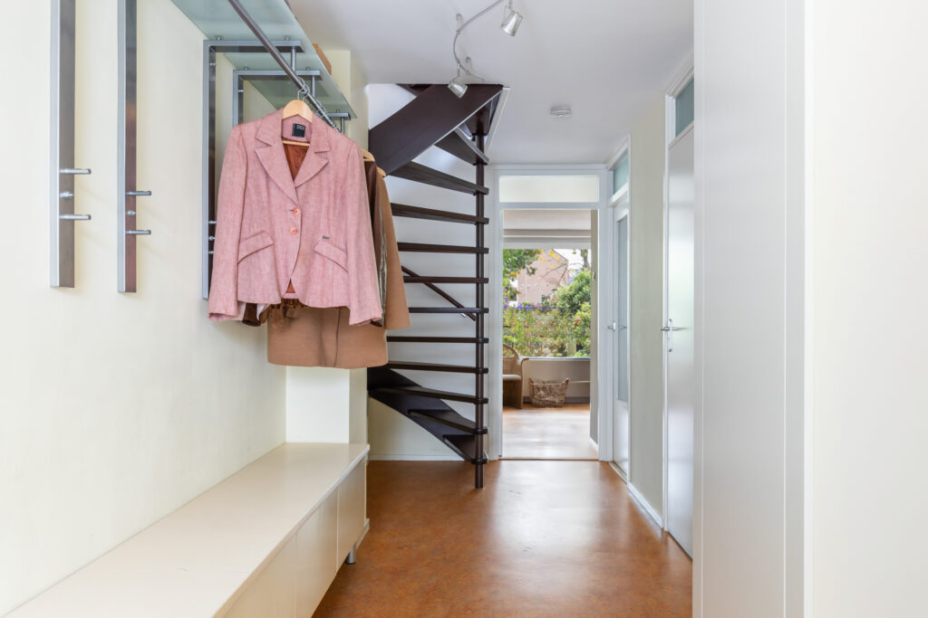 De entree biedt toegang tot de ruime en lichte hal met vernieuwde meterkast, garderobe, toilet met fontein, inpandige wasruimte, slaapkamer aan de voorzijde, tuinslaapkamer aan de achterzijde en trapopgang naar boven.