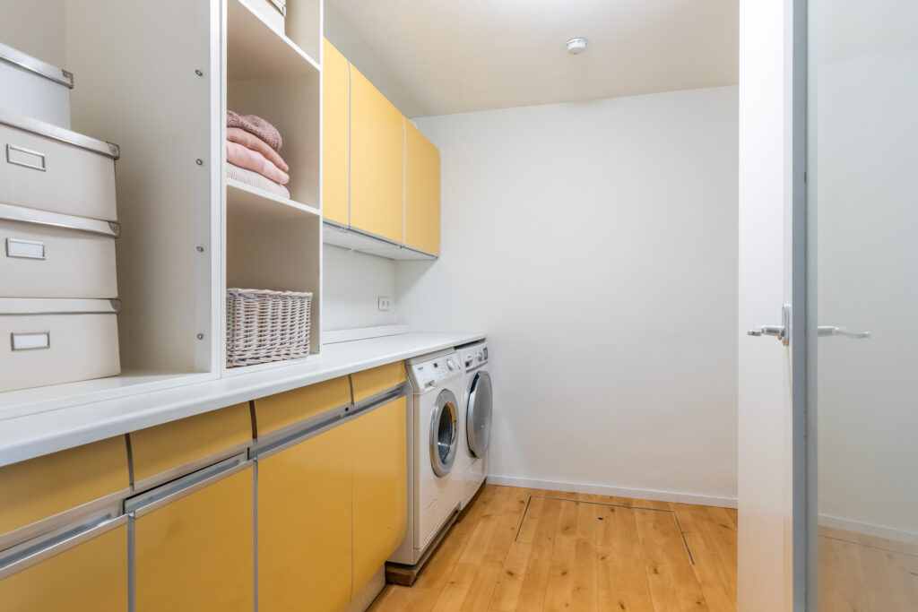 De wasruimte (ca. 7m²) behoorde oorspronkelijk bij de garage, evenals de slaapkamer aan de voorzijde, maar is nu bij de woning betrokken. Hierdoor is er een fijne wasruimte ontstaan met opstelplaats van de was- en droogmachine, afgesloten stookruimte met de CV-ketel (Nefit 2022), een groot werkblad en veel bergruimte. Eventueel kan hier een keuken worden gerealiseerd of een tweede badkamer.
