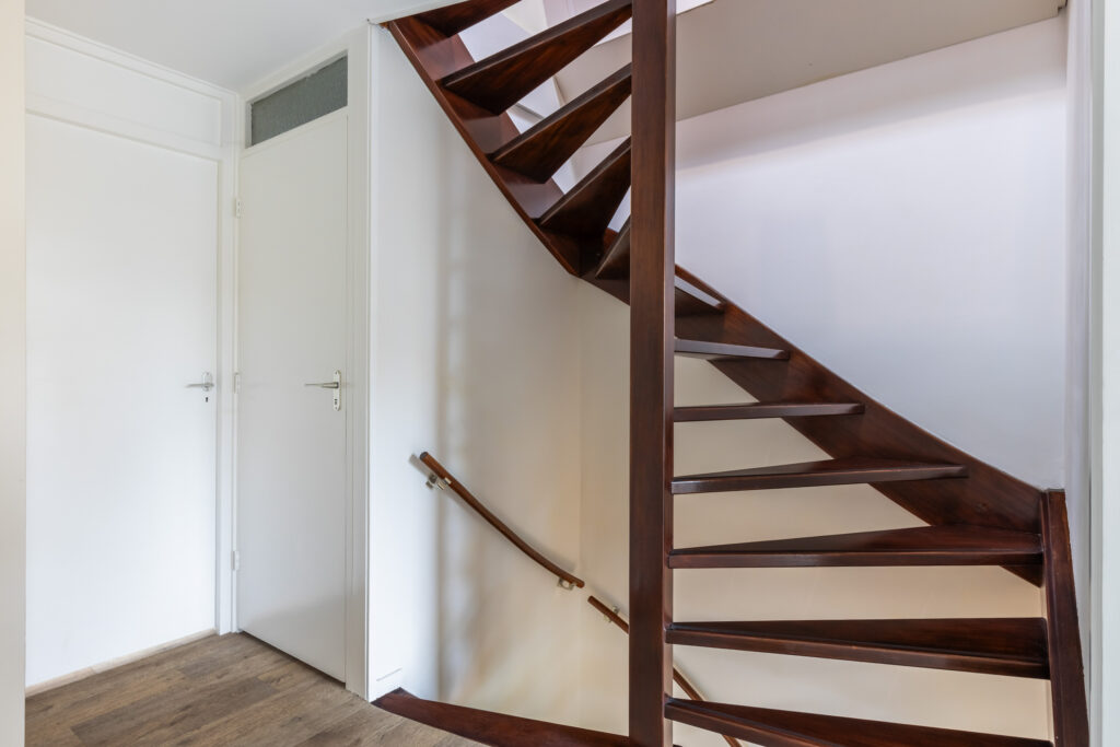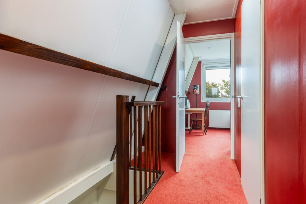 Vanaf de overloop op de tweede verdieping zijn drie slaapkamers, de badkamer, toiletruimte en de derde verdieping bereikbaar.