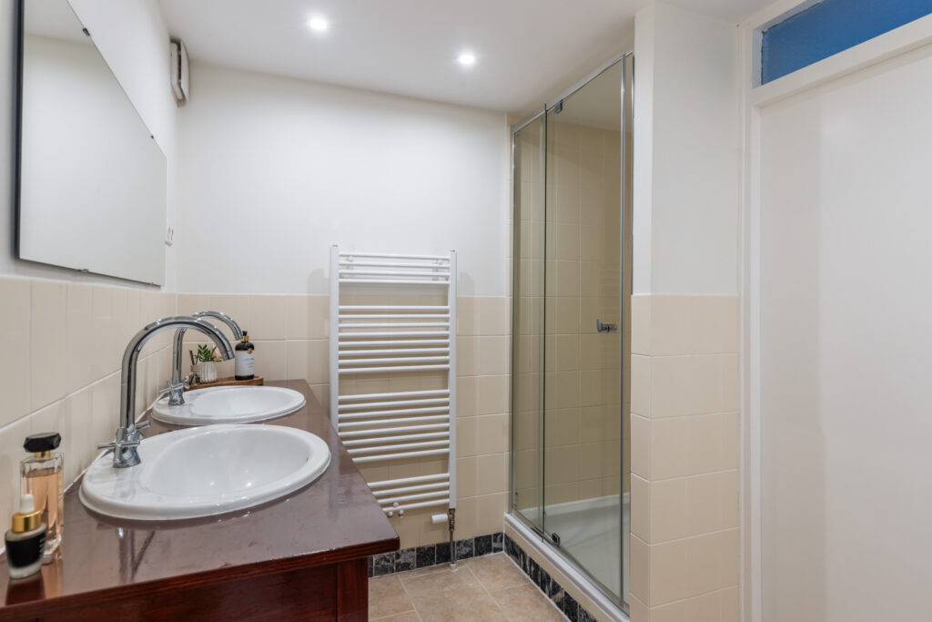 De ruime badkamer is compleet uitgerust en voorzien van een inloopdouche met glazen douchedeur, wastafelmeubel met dubbele waskommen en verlichting, een ligbad en een designradiator.