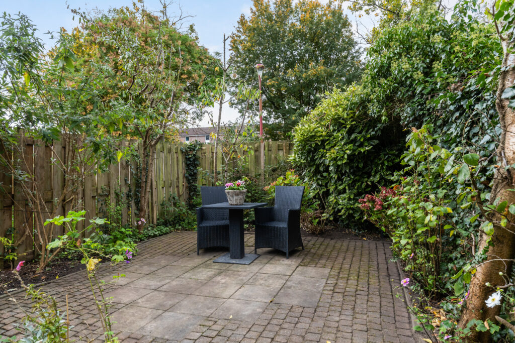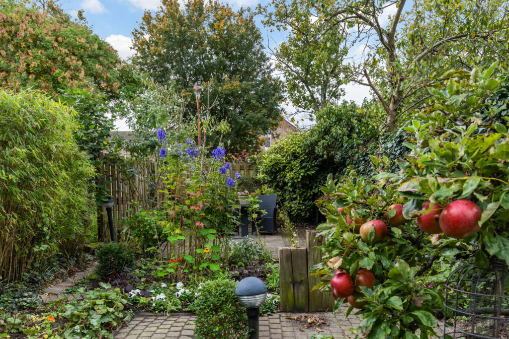 De diepe achtertuin van maar liefst 17 meter, gelegen op het zuiden, is voorzien van sierbestrating en een prachtige diversiteit aan borders met bloemen, planten, bomen en struiken. Daarnaast is de tuin uitgerust met een houten schutting, een stopcontact, een buitenkraan en een praktische achterom.