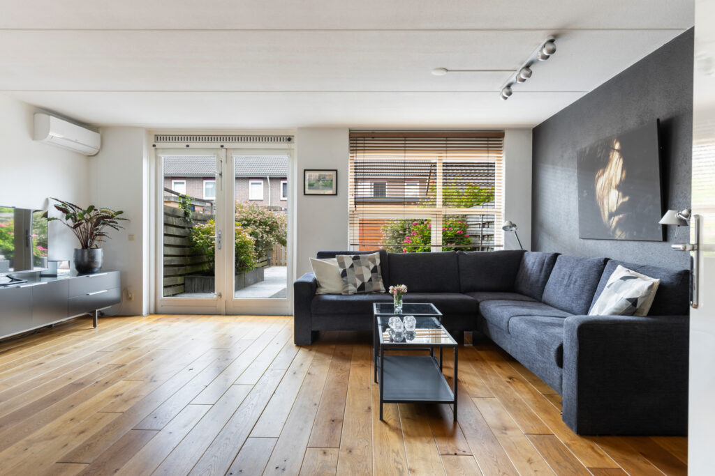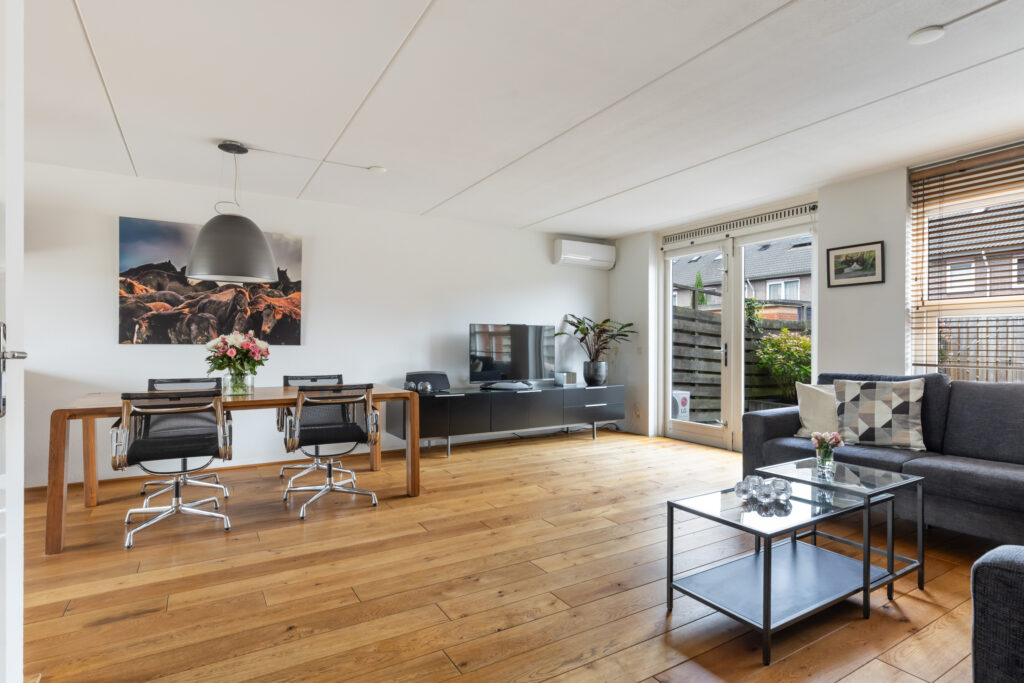 De lichte en ruime woonkamer bevindt zich aan de achterzijde van de woning en beschikt over dubbele openslaande deuren naar de zonnige achtertuin. Voor extra comfort is er een airconditioning en een elektrisch bedienbaar zonnescherm aanwezig.