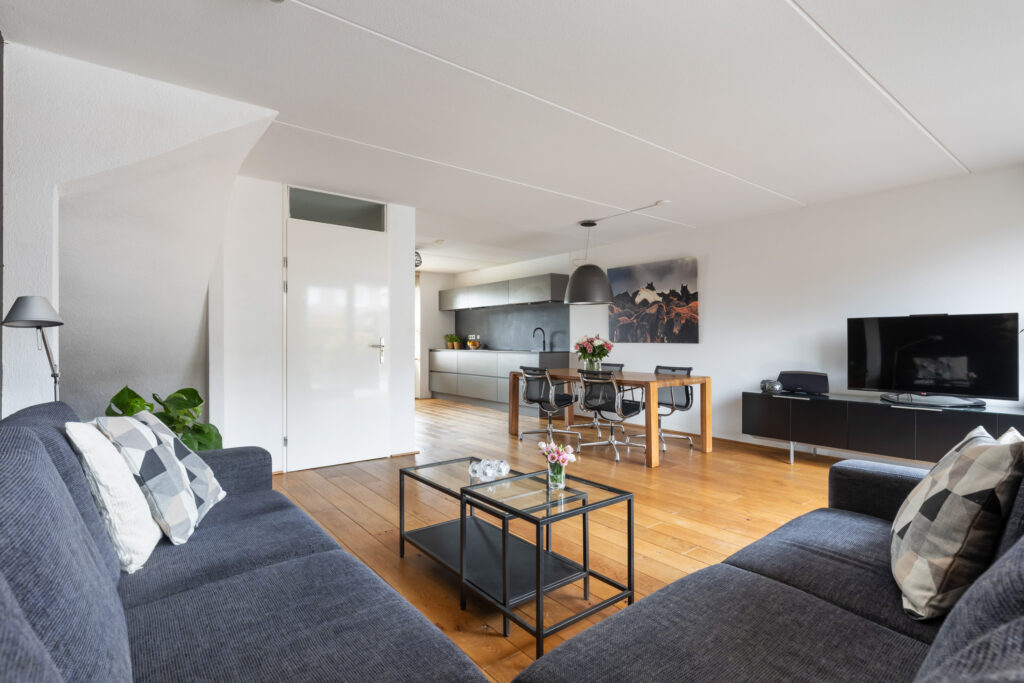 woonkamer (ca. 31 m²) met aan de voorzijde naar de open keuken (ca. 13 m²) met grote raampartij.