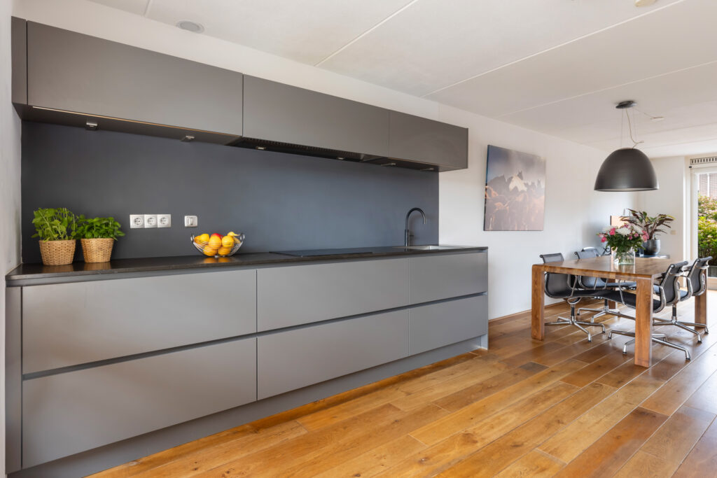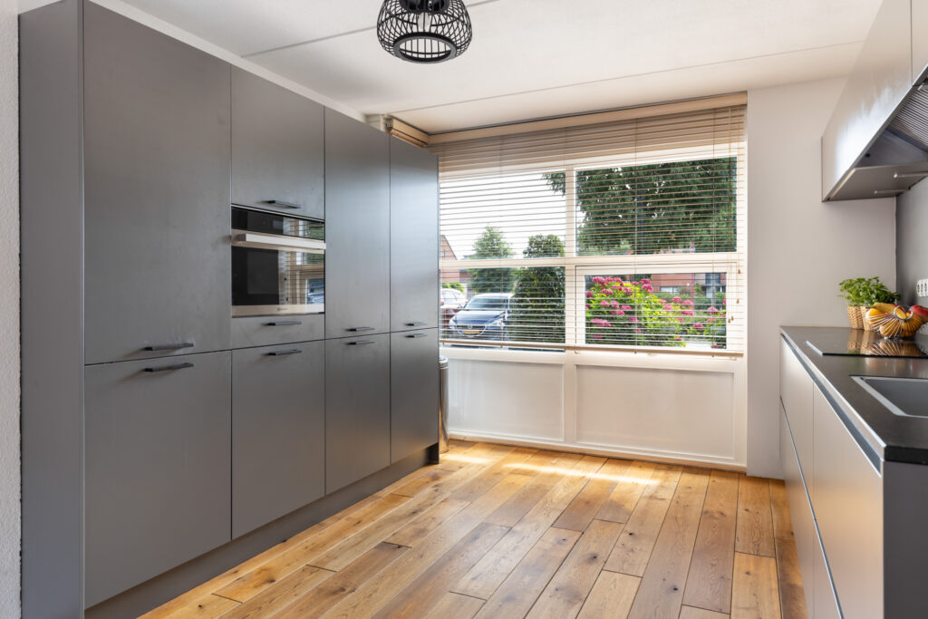 Het composieten werkblad met RVS spoelbak zorgt voor een luxe uitstraling, terwijl je hier beschikt over diverse hoogwaardige inbouwapparatuur: een 4-pits inductiekookplaat en combi-oven (Bauknecht), een geïntegreerde RVS afzuigkap, vaatwasser (Bauknecht), grote koelkast (Bauknecht), vriezer (AEG) én een praktische Quooker voor direct kokend water. Dankzij de vele kasten en lades met softclose-techniek heb je bovendien volop opbergruimte. Kortom, een moderne keuken waar comfort en stijl samenkomen.