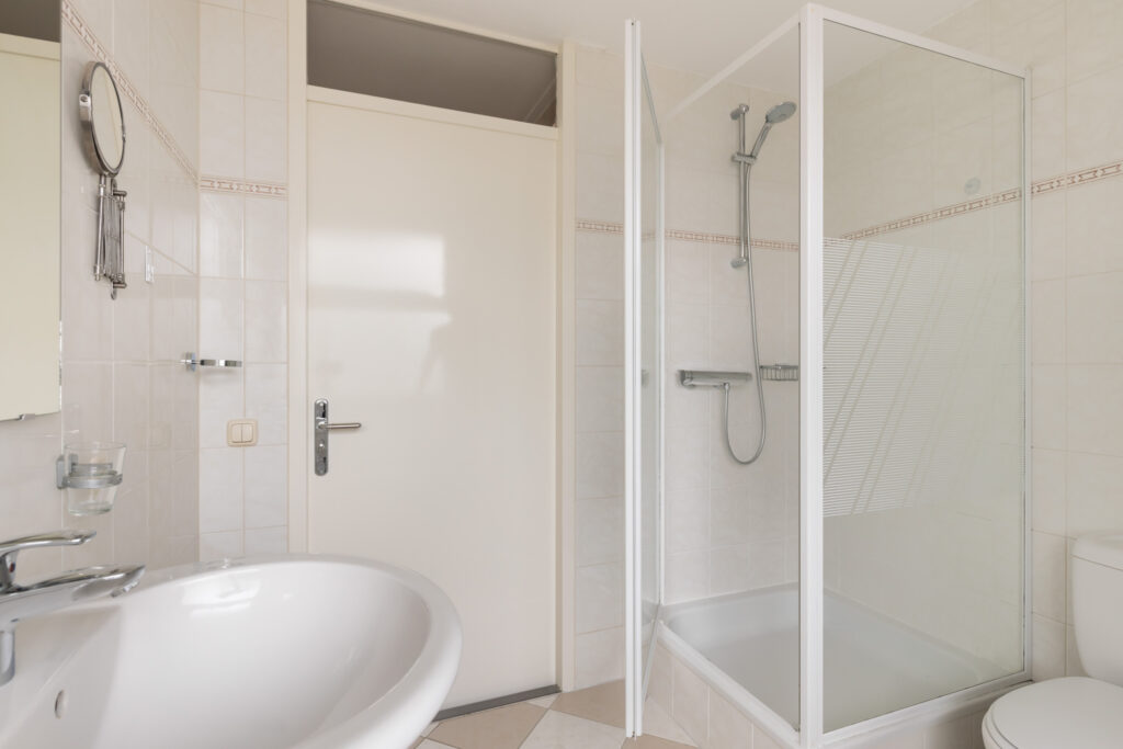 De badkamer is volledig betegeld en voorzien van een douchecabine, een ligbad, een wastafel met spiegel, een staand toilet en een radiator. Dankzij de raampartij geniet je van natuurlijk daglicht en extra ventilatie.