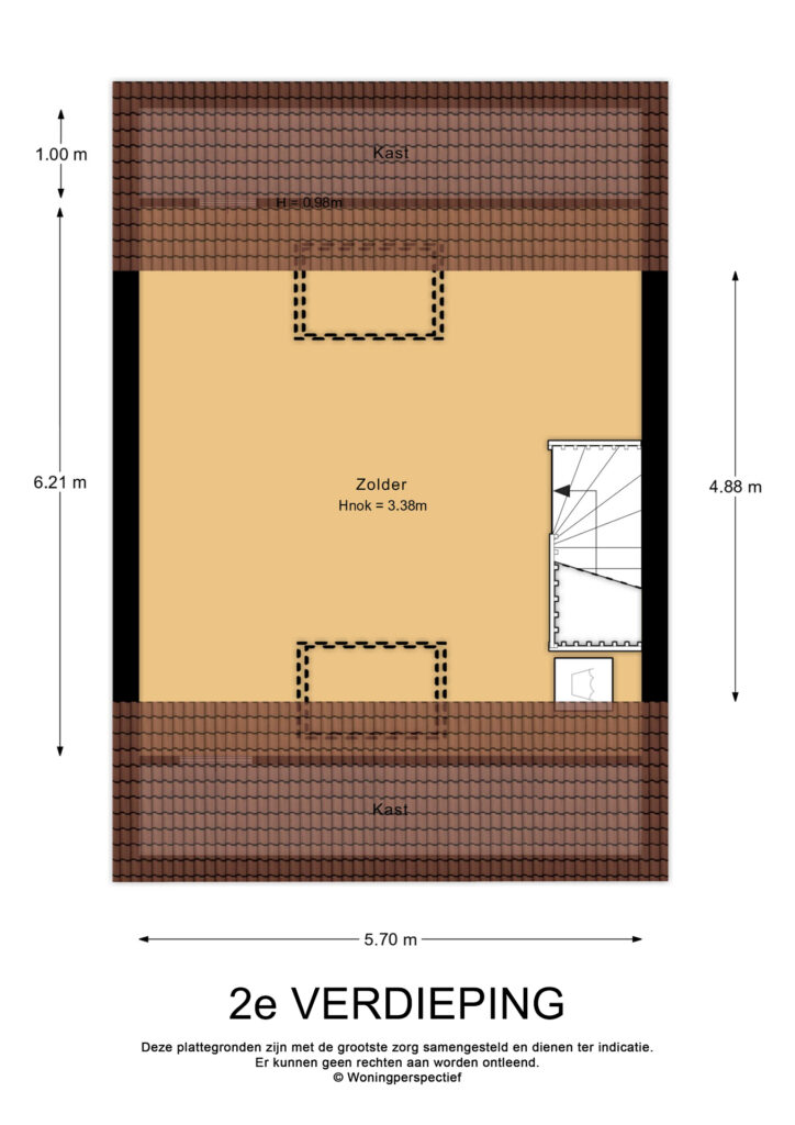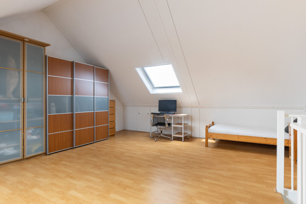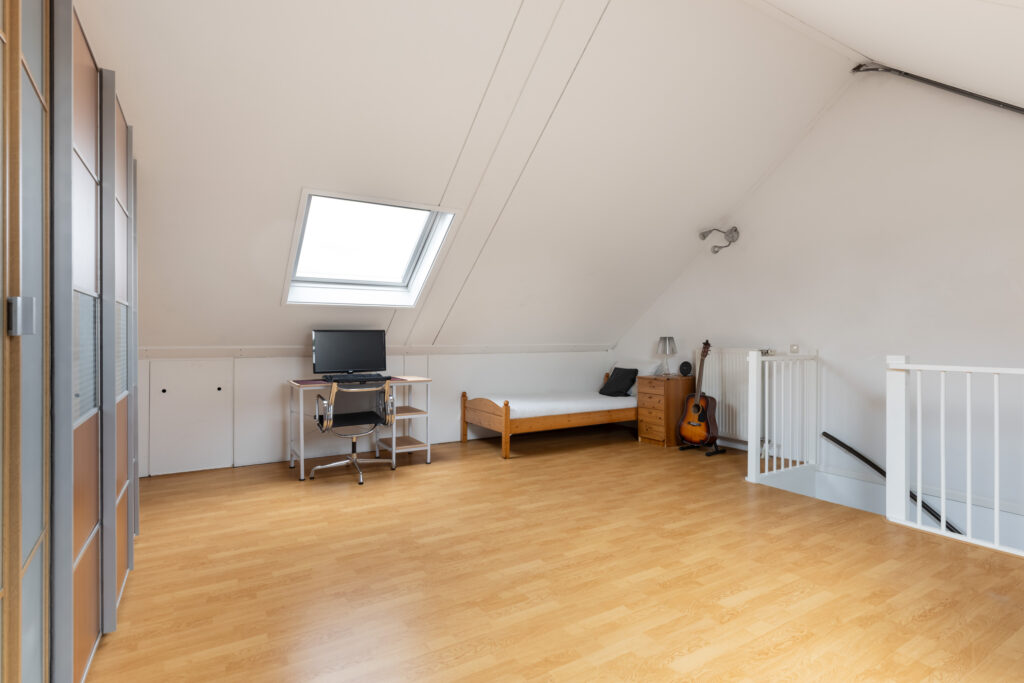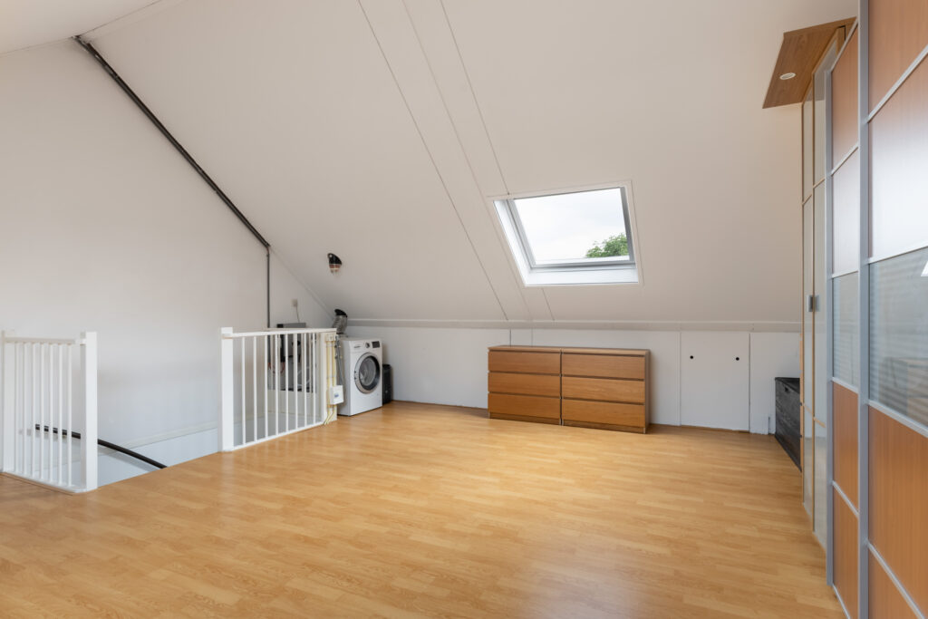 Via de vaste trap bereik je de ruime zolderverdieping (ca. 27 m²). Hier vind je de aansluitingen voor de was- en droogmachine, de mechanische ventilatie-unit en de omvormer voor de zonnepanelen. Dankzij de grote dakramen aan zowel de voor- als achterzijde (Velux en voorzien van verduisterende raambekleding) is deze ruimte heerlijk licht. Achter de knieschotten is praktische bergruimte gecreëerd. De zolder biedt volop mogelijkheden, bijvoorbeeld voor het realiseren van twee extra slaapkamers.
