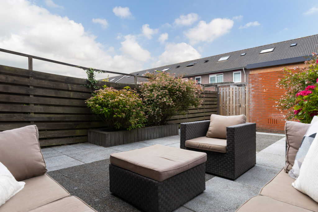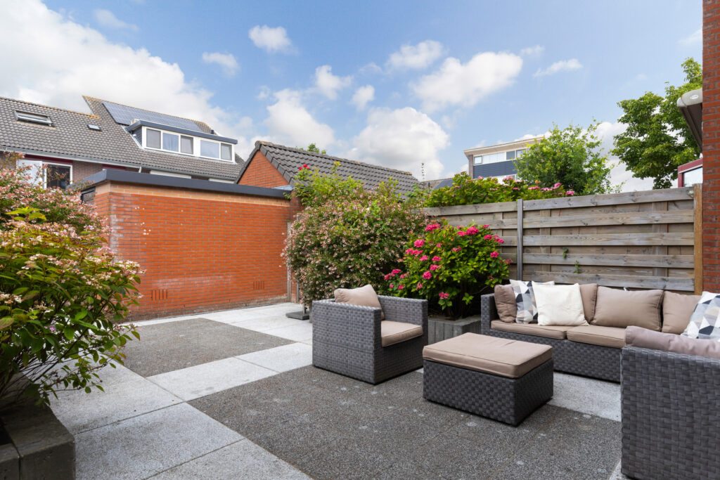 De achtertuin ligt op het westen en biedt grenzend aan de woning een heerlijk zonneterras om van de middag- en avondzon te genieten. Verder is de tuin voorzien van groene plantenborders, een houten schutting, een buitenkraan aan zowel de voor- als achterzijde, een stenen berging én een achterom met dubbele houten poort, ideaal voor bijvoorbeeld het stallen van een motor.