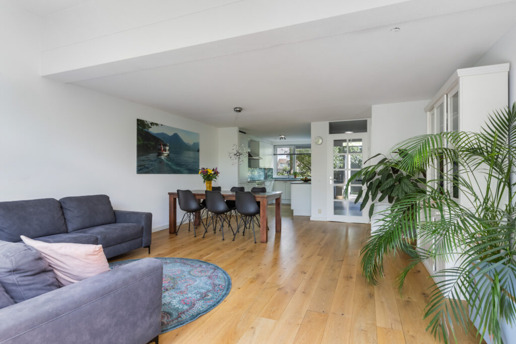 De ruime tuingerichte woonkamer (ca. 33 m²) is dankzij de grote raampartijen aan weerszijden heerlijk licht. Verder is de woonkamer voorzien van een praktische trapkast en sfeervolle zonwering. De openslaande deuren zorgen voor een fijne verbinding met de achtertuin