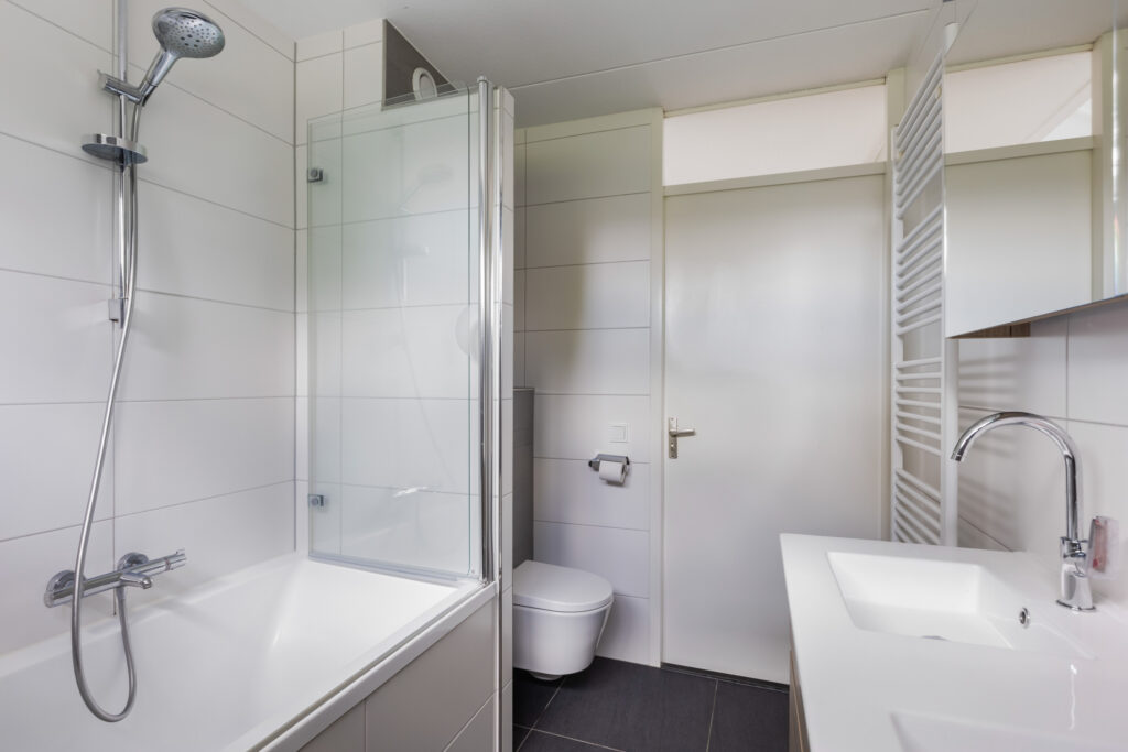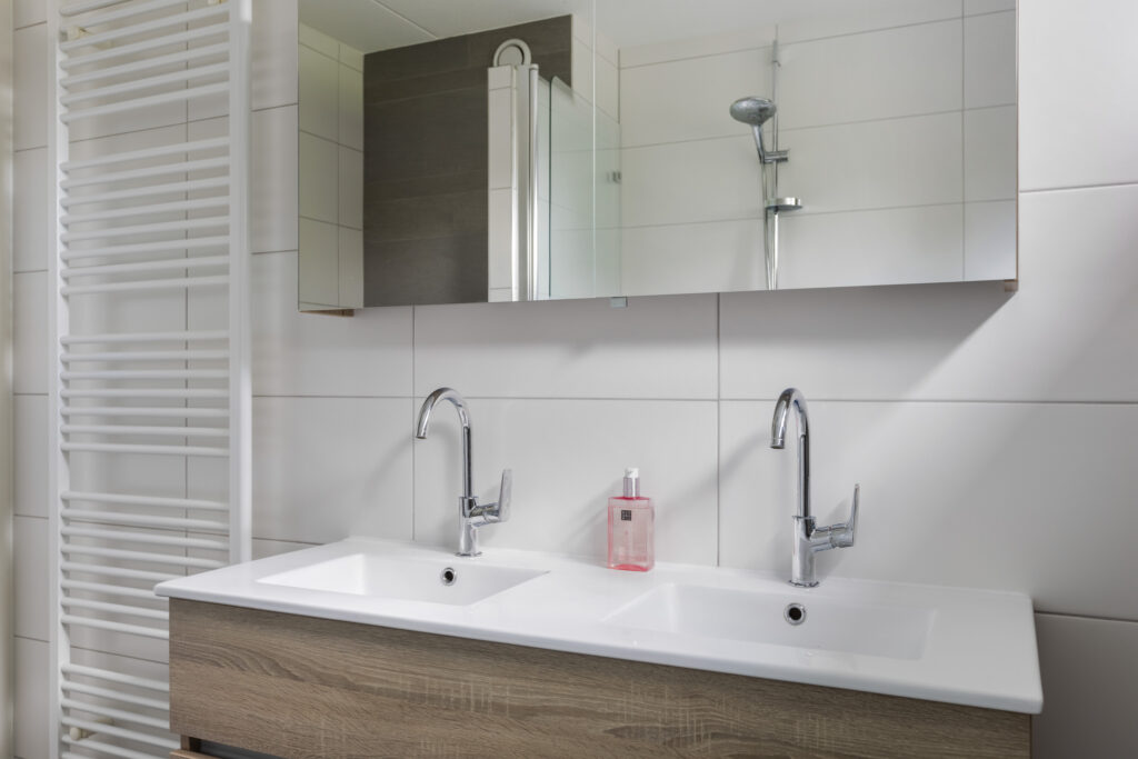 De moderne badkamer (2018) is voorzien van een ruime douchebad combinatie met glazen douchewand, wasmeubel met dubbele wastafel en spiegelkast met verlichting en een vrij hangend toilet.