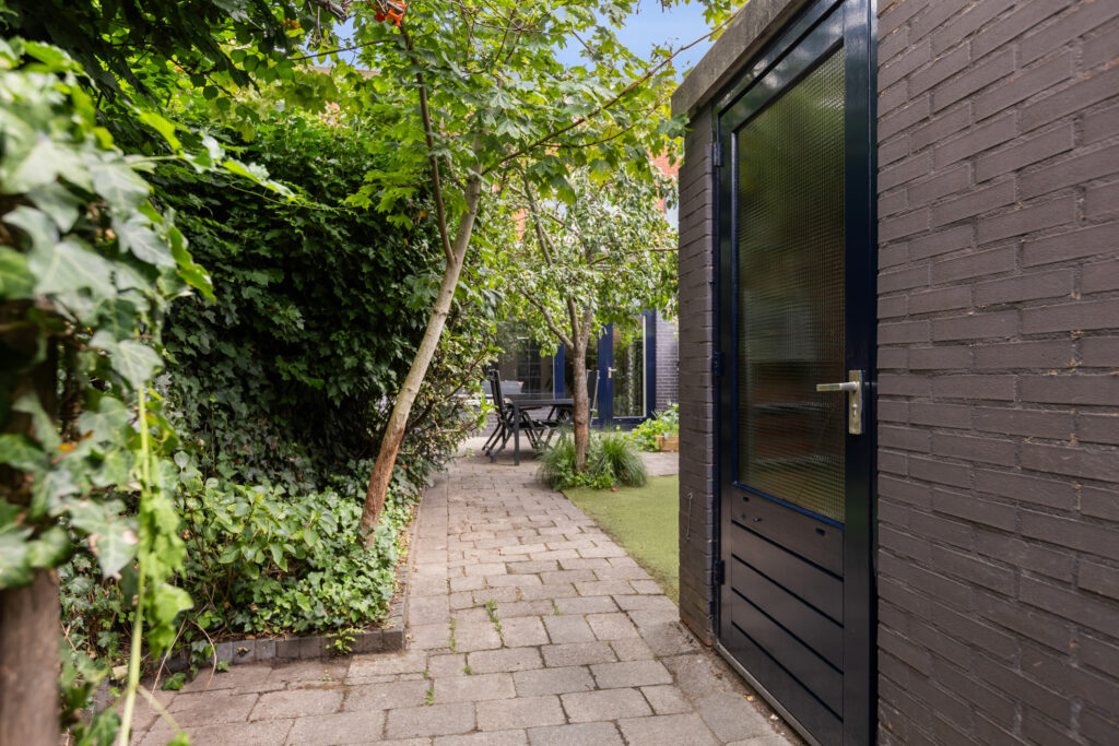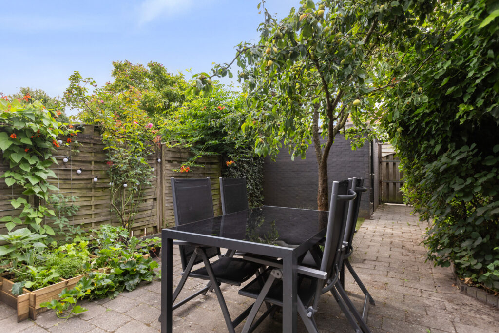 De zonnige en beschutte achtertuin, gelegen op het zuiden, is een heerlijke plek om te ontspannen. De tuin is voorzien van een zonneterras, een speelgazon van kunstgras en wordt omringd door een houten schutting en groen. Praktisch zijn ook de buitenkraan, de regenton, ruime vrijstaande stenen berging (met elektra) en de handige achterom. De twee boompjes bieden veel schaduw en lenen zich perfect voor een hangmat. De ideale plek om te genieten van het zomerse buitenleven.