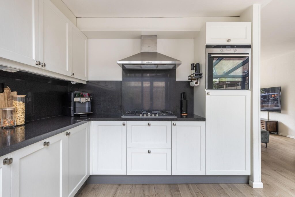 De moderne L-vormige keuken is voorzien van een composiet werkblad, verlichting, RVS spoelbak en diverse inbouwapparatuur, zoals een 5-pits gaskookplaat met wokbrander (Siemens), RVS afzuigkap (Siemens), heteluchtoven (Siemens), koelkast en grote vriezer (Siemens) en een vaatwasser (Siemens). De keuken biedt veel opbergruimte dankzij de vele lades (softclose) en is voorzien van sfeervolle spotjes. Vanuit de keuken is de tuin bereikbaar middels een openslaande deur.