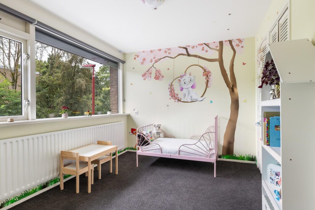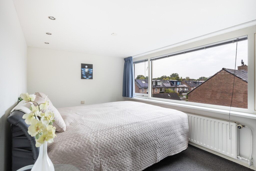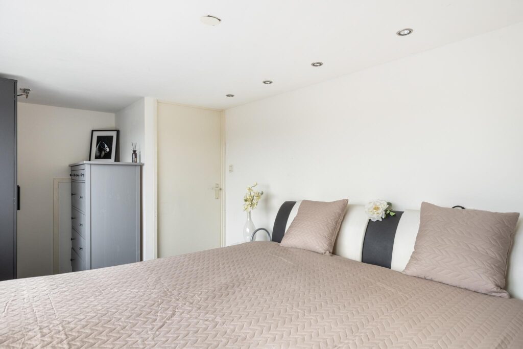 Aan de achterzijde bevindt zich de 2e slaapkamer (ca. 11m²) voorzien van vaste kast en spotjes.