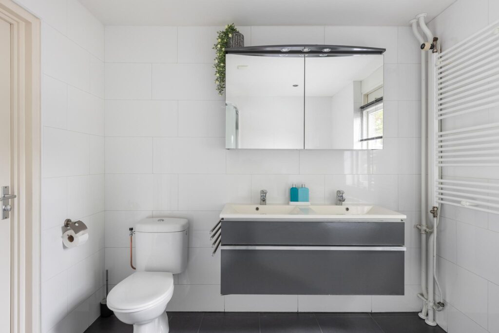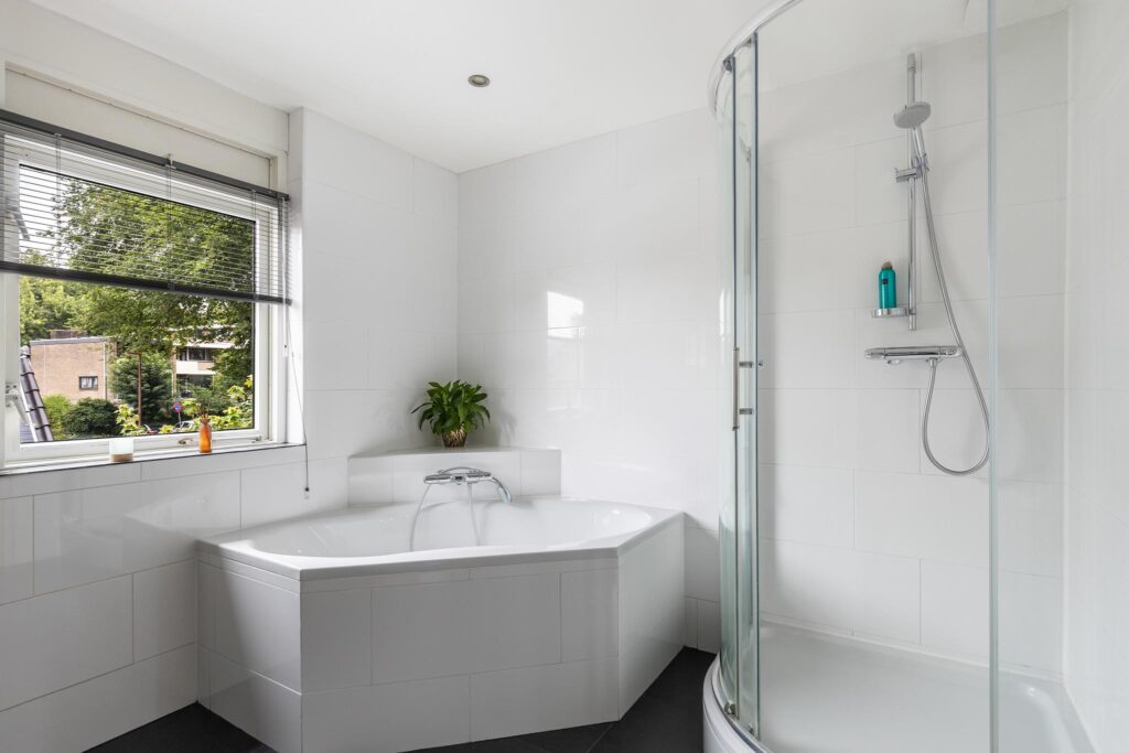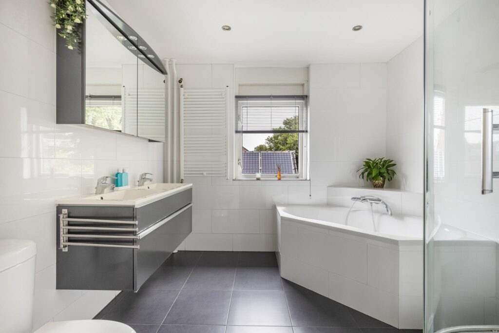 De ruime en geheel betegelde badkamer is uitgerust met een duo hoekbad, dubbele wastafelmeubel met spiegelkast en verlichting, inbouwspots, designradiator, toilet en een raampartij.
