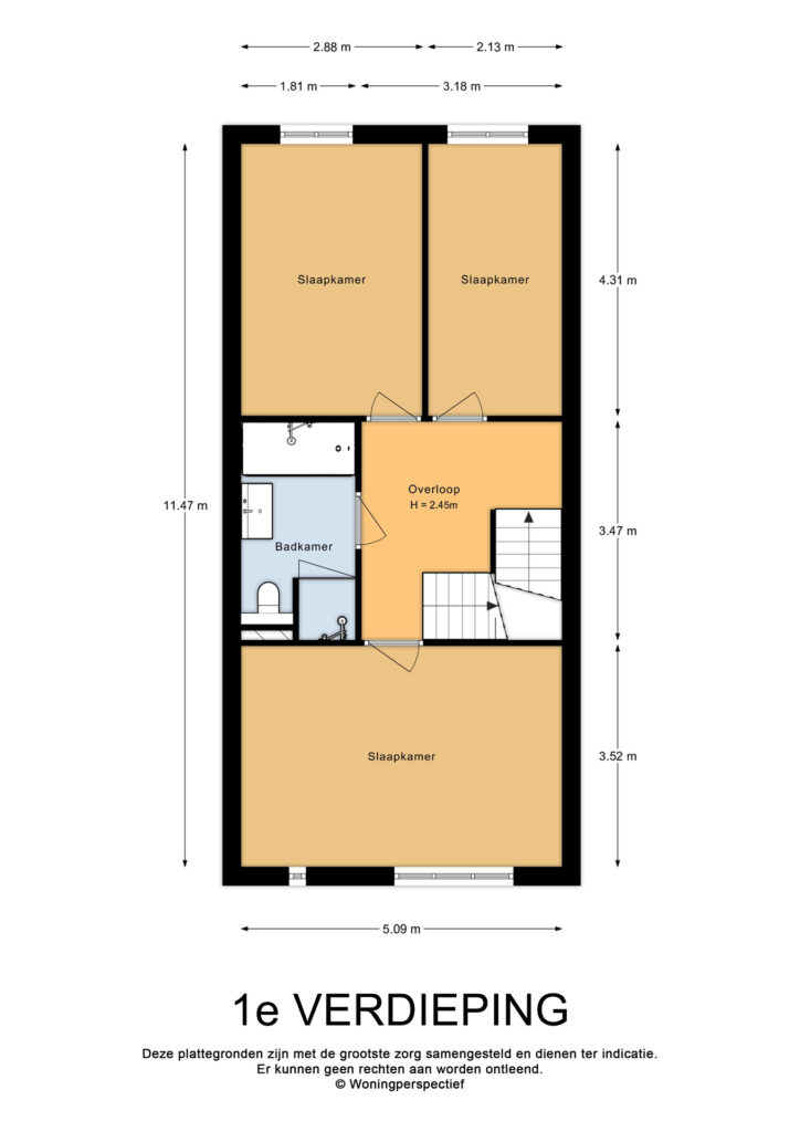 Via de trap bereik je de ruime overloop van de eerste verdieping met toegang tot twee slaapkamers (ca. 9m², ca. 12m²) aan de achterzijde, badkamer en een royale derde slaapkamer (ca. 18m²) aan de voorzijde.