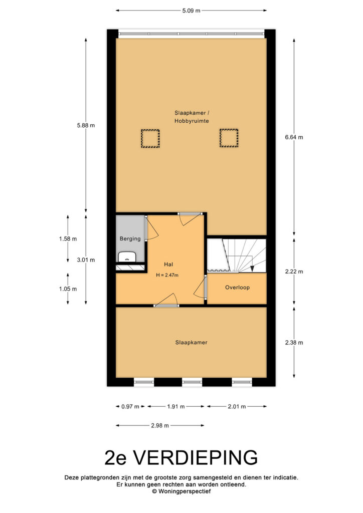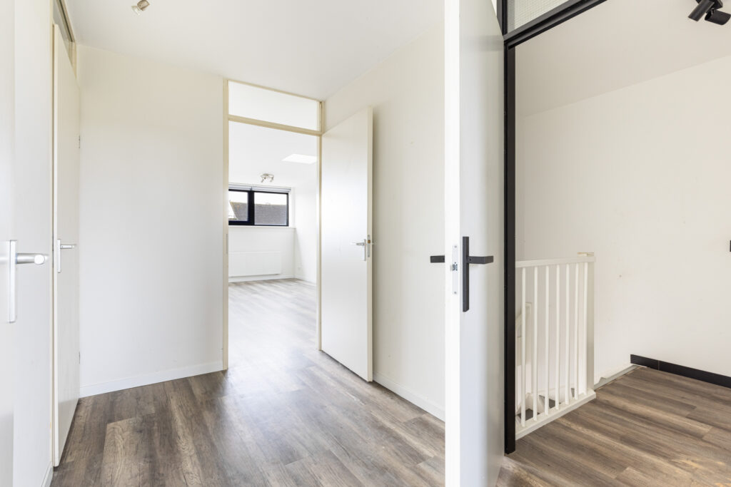 Via de trap bereik je de overloop van de tweede verdieping. De huidige bewoners hebben deze verdieping uitgebreid met een dakopbouw, waardoor hier twee royale slaapkamers en een separate bergruimte zijn gerealiseerd.