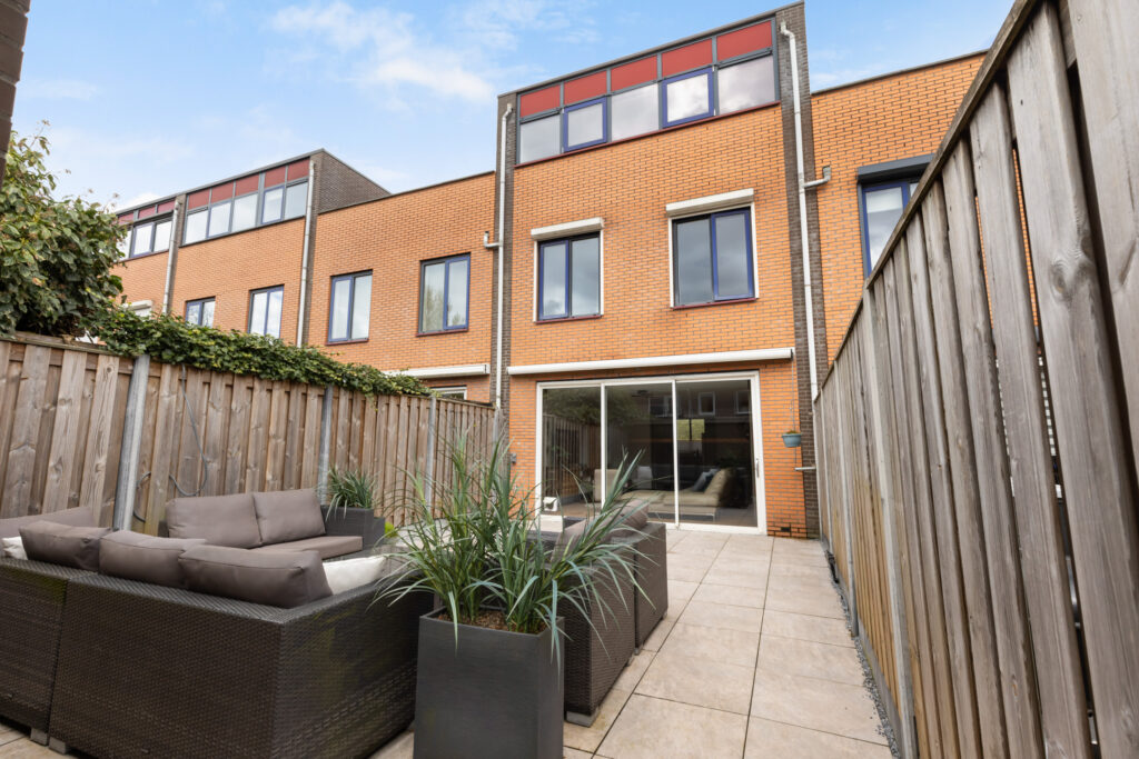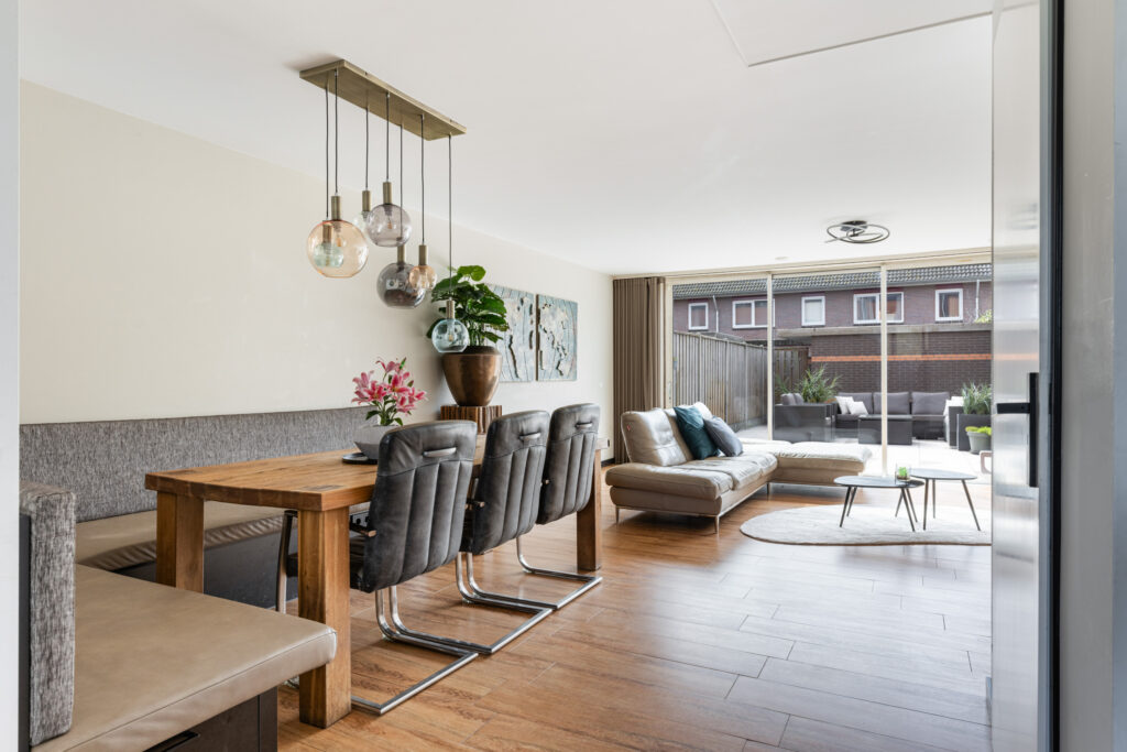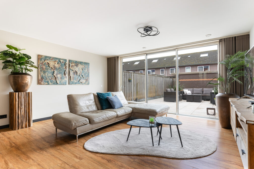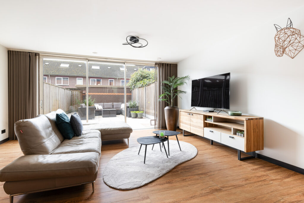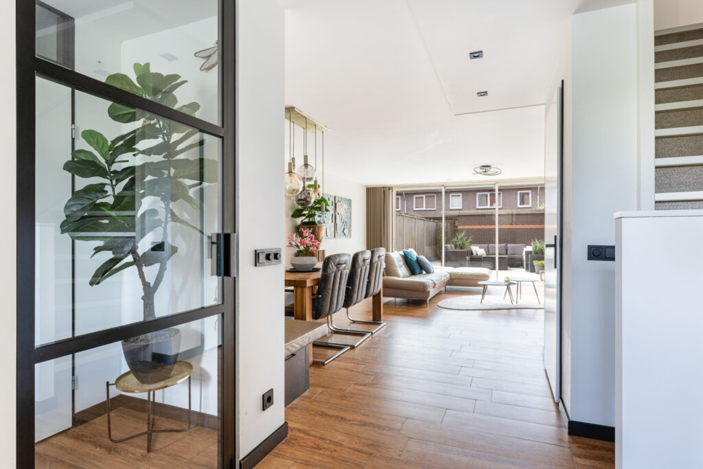 Via de stijlvolle stalen deur heb je toegang tot de royale, tuingerichte woonkamer (ca. 40m²). Deze is heerlijk licht dankzij de grote raampartij die een naadloze verbinding met de tuin creëert. Daarnaast is de woonkamer uitgerust met een praktische trapkast en voor extra comfort is de achtergevel voorzien van een zonnescherm.