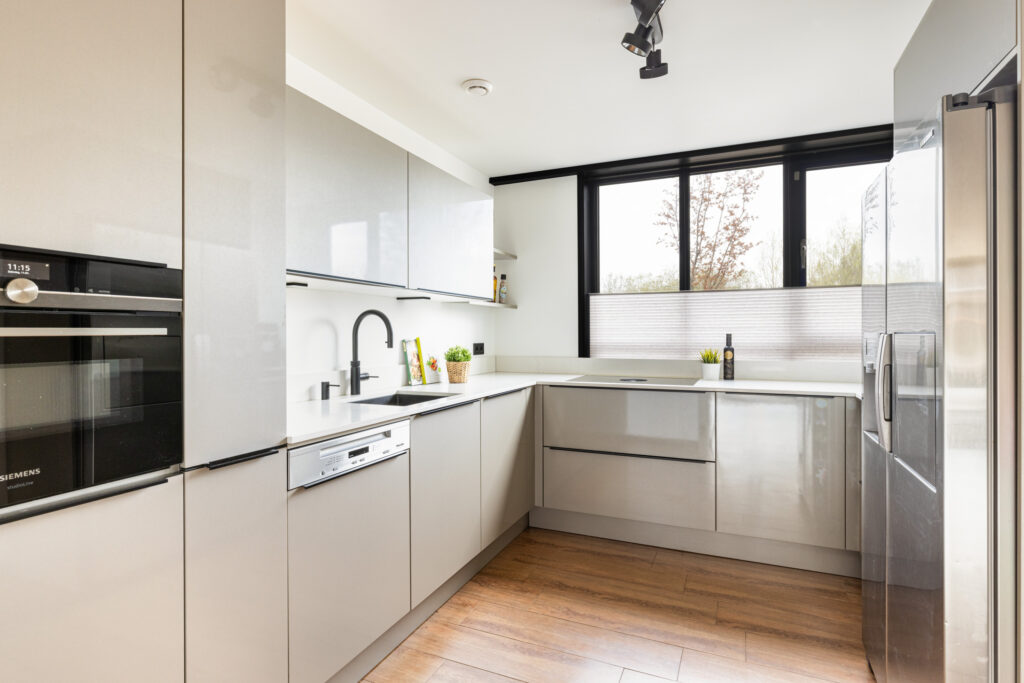 In deze stijlvolle woonkeuken (2022) geniet je aan een overvloed van natuurlijk licht dankzij de grote raampartijen. De keuken is uitgevoerd in een elegante hoogglansafwerking en beschikt over een licht gemêleerd composiet werkblad. De praktische zwarte Quooker-kraan met bijpassende spoelbak en de hoogwaardige inbouwapparatuur zorgen voor optimaal gebruiksgemak. Zo is de keuken uitgerust met een 4-pits inductiekookplaat van Bora met geïntegreerde kookbladafzuiging, een combi-oven van Siemens, een vaatwasser van Miele en een Amerikaanse koelkast van Samsung. Sfeervolle inbouwspotjes en kasten en lades met softclose maken het geheel compleet en bieden volop praktische bergruimte.