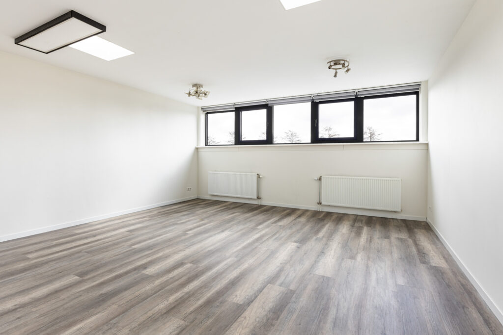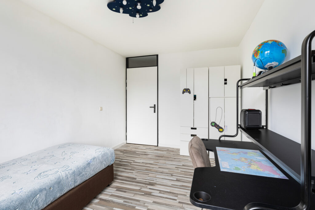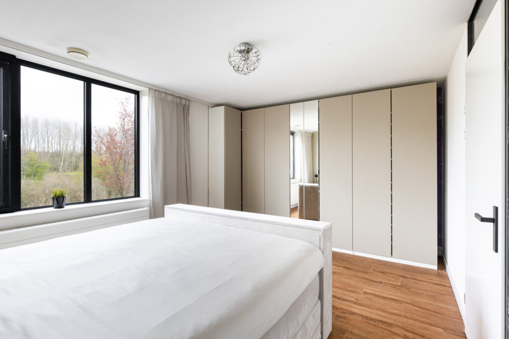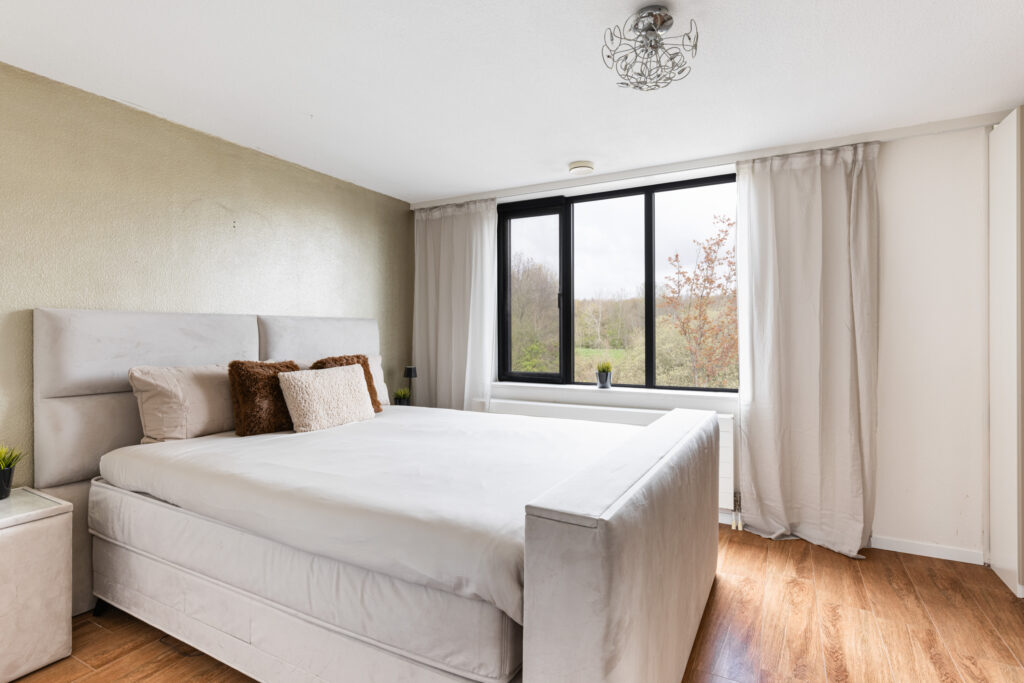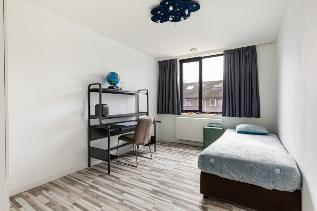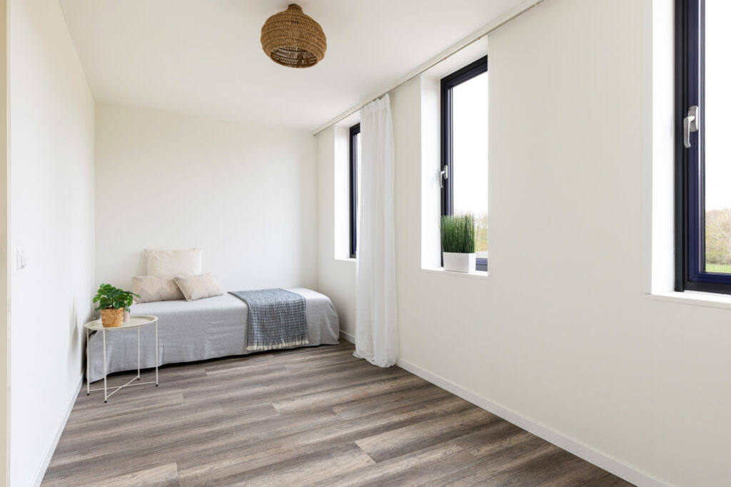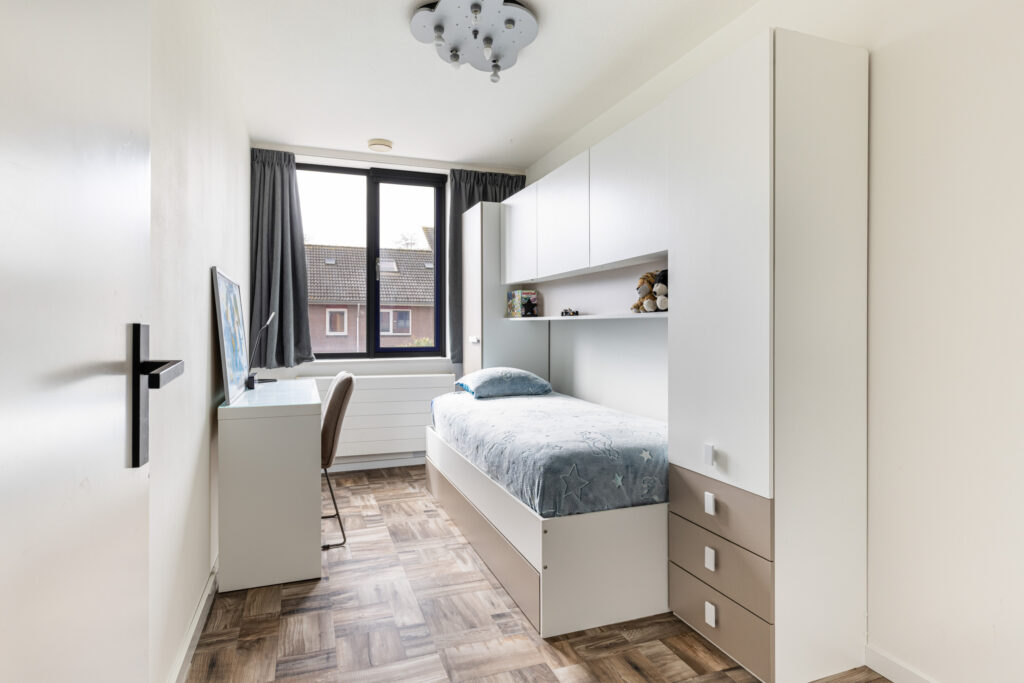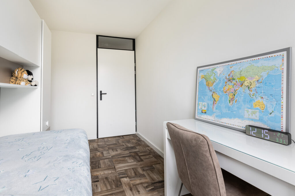 De slaap-/werkkamer (ca. 12m²) aan de voorzijde beschikt over een grote raampartij met uitzicht over de groene rand van Galecop.