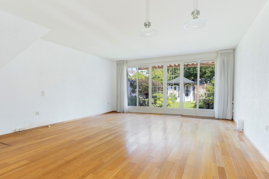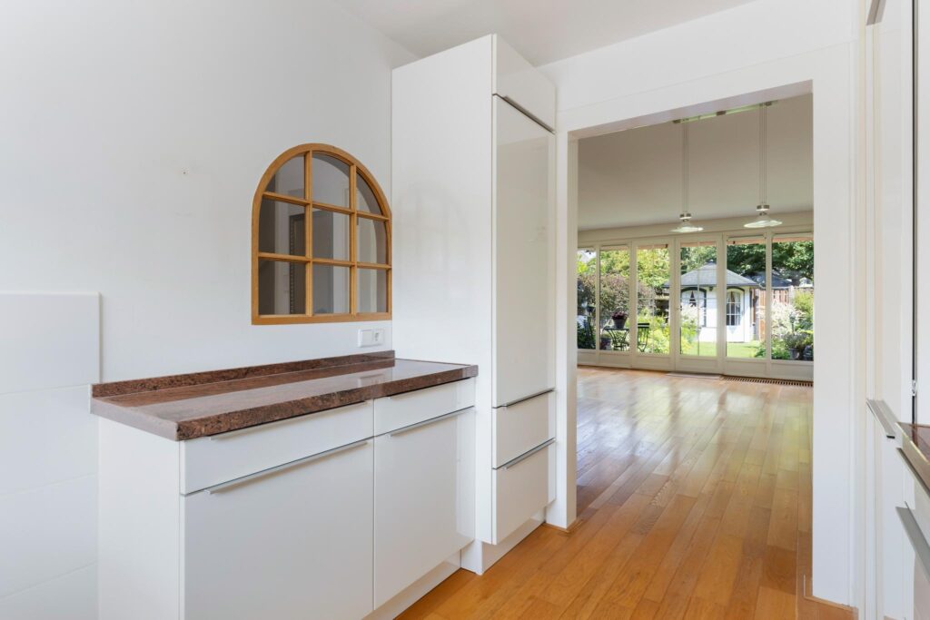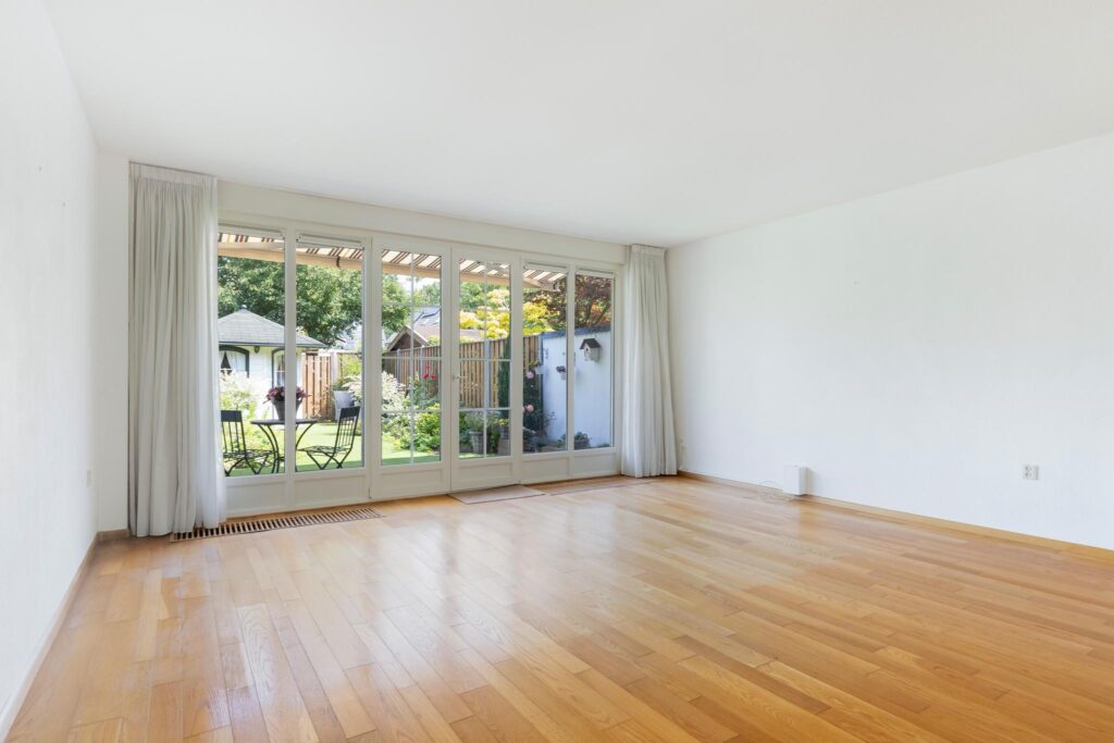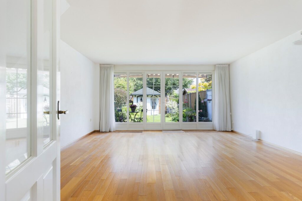 De lichte woonkamer (ca. 33m²) wordt gekenmerkt door een royale raampartij en openslaande deuren naar de achtertuin, wat zorgt voor een prettige lichtinval en een directe verbinding met buiten. Voor extra comfort en privacy zijn de deuren voorzien van rolluiken en een elektrisch bedienbaar zonnescherm.