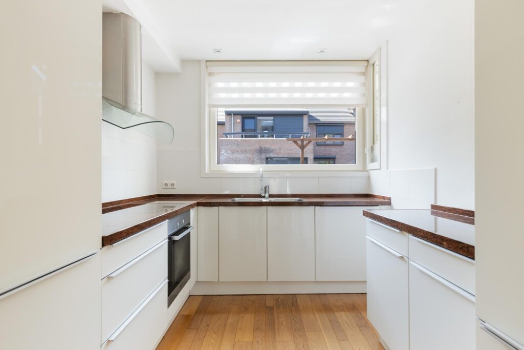De open keuken (ca. 7m²) is uitgevoerd in een praktische U-opstelling en is van alle gemakken voorzien. Het fraaie granieten werkblad en de dubbele RVS spoelbak geven de keuken een luxe uitstraling. De inbouwapparatuur bestaat uit een 4-pits inductiekookplaat (Miele), RVS afzuigkap (Miele), heteluchtoven (Miele), vaatwasser (AEG) en een koel-/vriescombinatie (Siemens). Dankzij de 10-liter boiler is er altijd snel warm water beschikbaar. Verder is de keuken voorzien van sfeervolle inbouwspotjes, softclose lades en kasten en een elektrisch bedienbaar zonnescherm voor extra comfort.