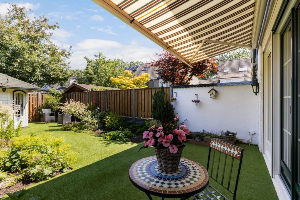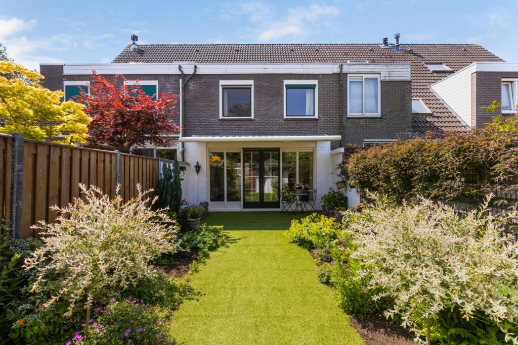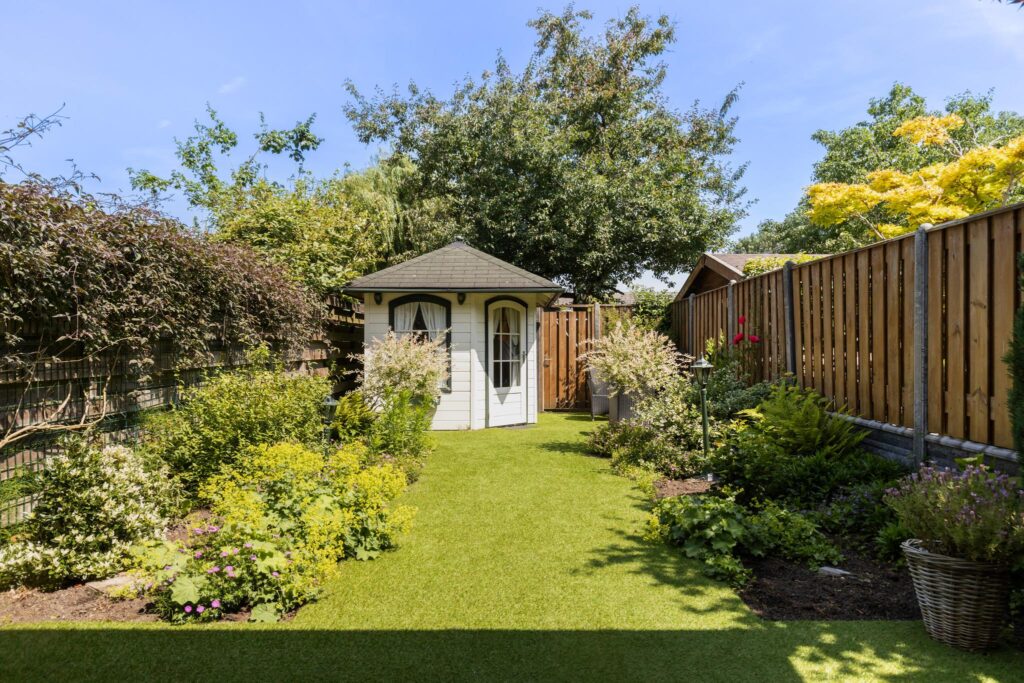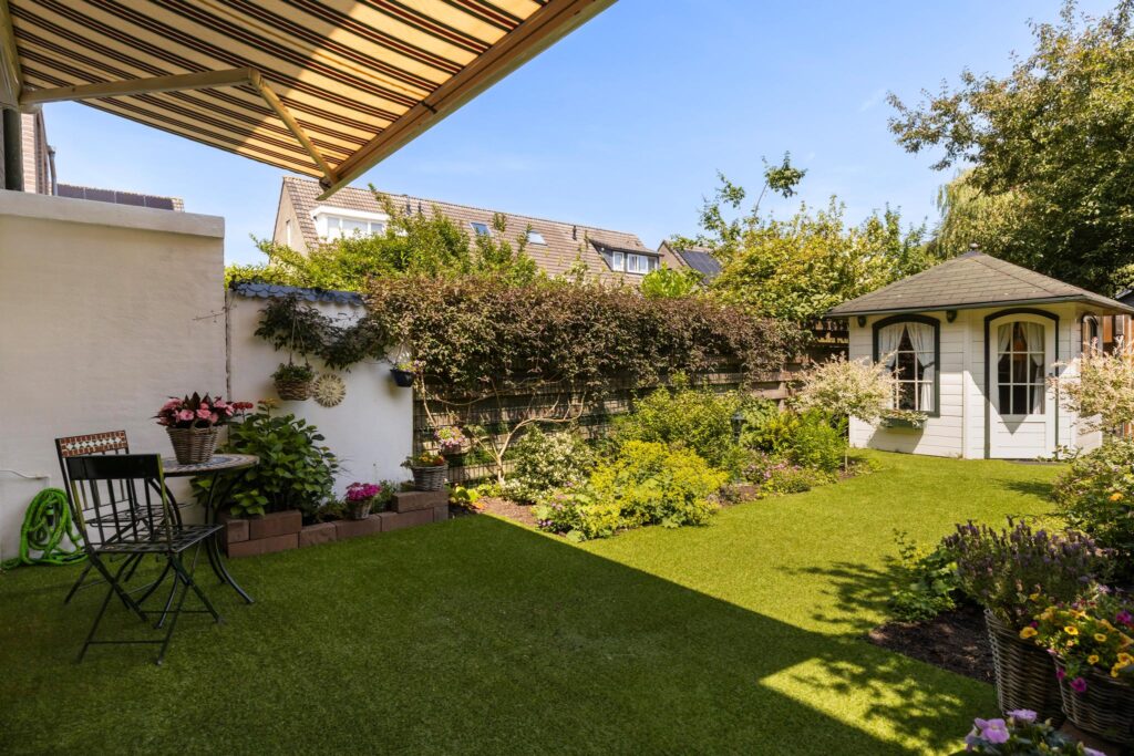 De diepe achtertuin ligt op het noorden, maar dankzij de vrije ligging geniet je hier vrijwel de hele dag van de zon. De tuin is fraai aangelegd met kunstgras, diverse borders met bloemen en planten, een houten schutting en praktische tuinverlichting. Daarnaast beschikt de tuin over een buitenkraan, een handige berging en een achterom.