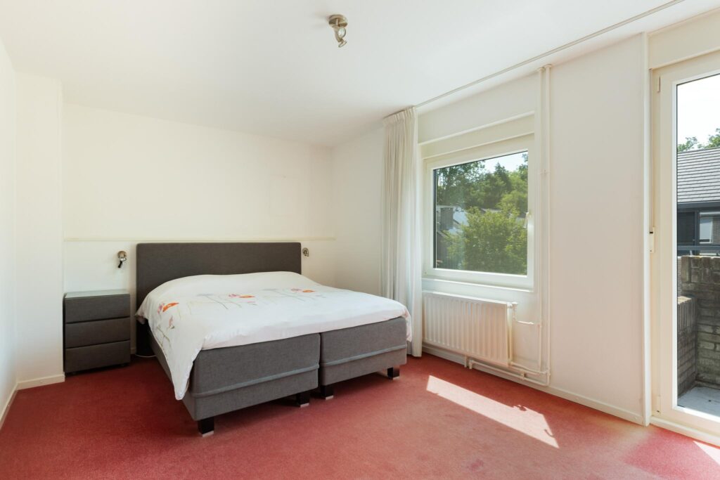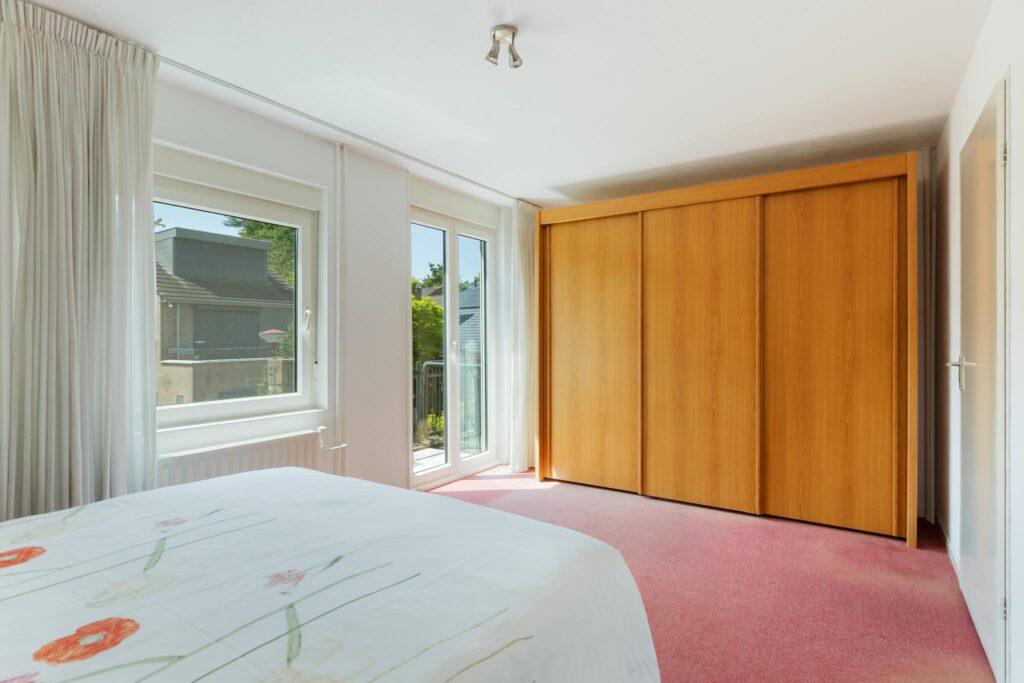 De slaapkamer aan de voorzijde (ca. 19m²) beschikt over een vaste linnenkast met schuifdeuren en is voorzien van een groot draai-kiepraam én dubbele openslaande deuren naar het balkon.