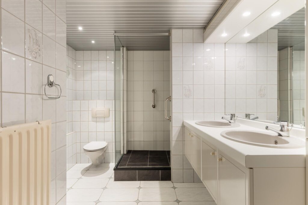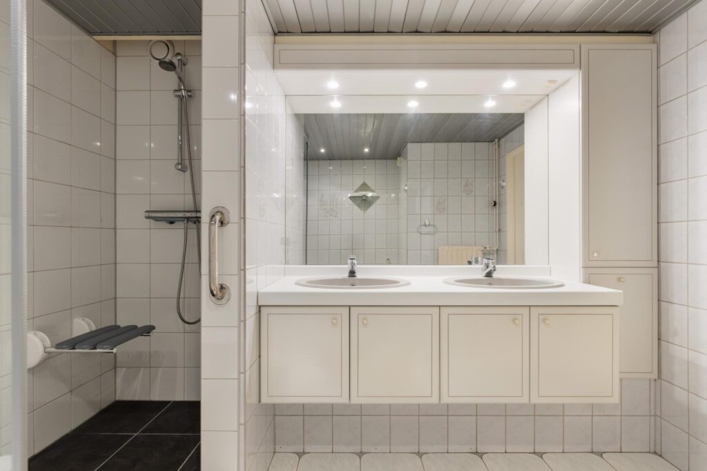 De ruime badkamer is voorzien van een moderne inloopdouche, een dubbel wastafelmeubel met spiegel en geïntegreerde verlichting, inbouwspots en een radiator. Daarnaast beschikt de badkamer over een toilet en een vaste kast voor extra opbergruimte.