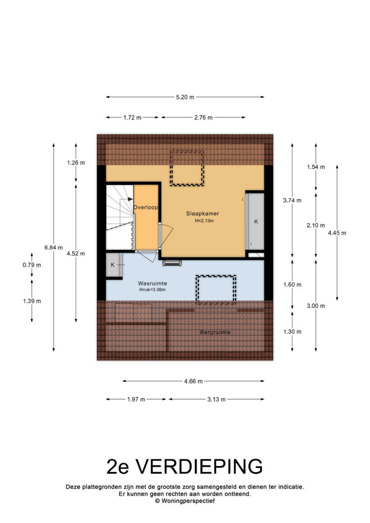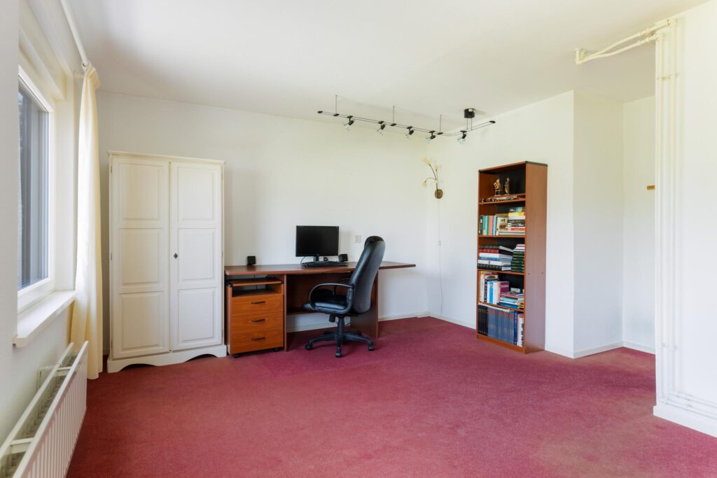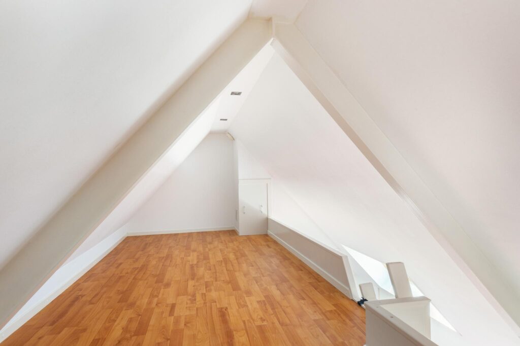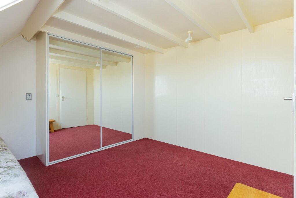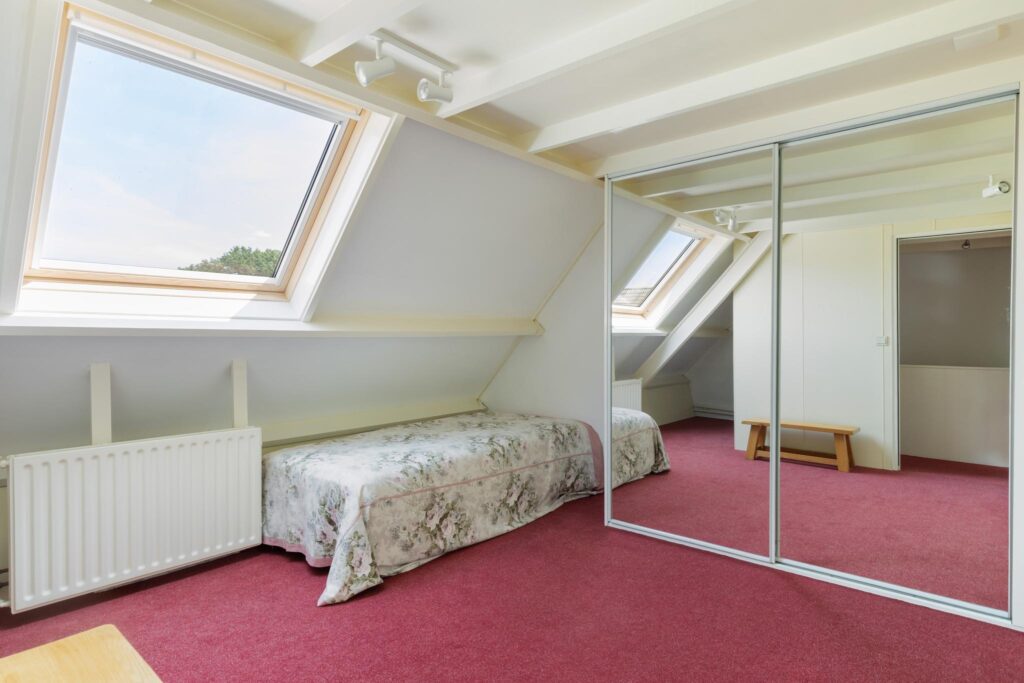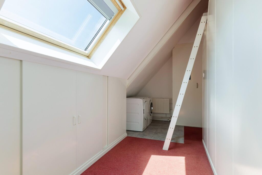 Aan de voorzijde ligt de vierde slaapkamer (ca. 7m²), eveneens uitgerust met een groot Velux dakraam met raambekleding. Deze kamer beschikt daarnaast over een praktische bergvliering, bereikbaar via een losse houten trap. In deze ruimte bevinden zich tevens de aansluitingen voor de was- en droogmachine, evenals een afgesloten CV-ruimte (Daalderop, 2005).