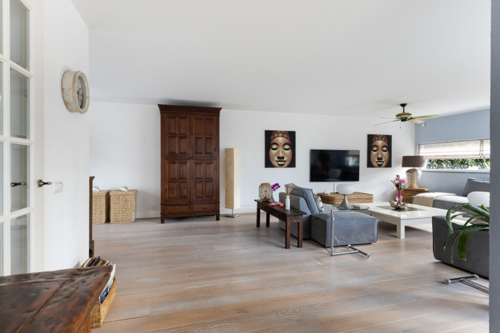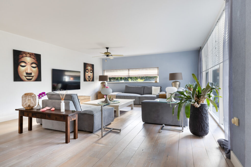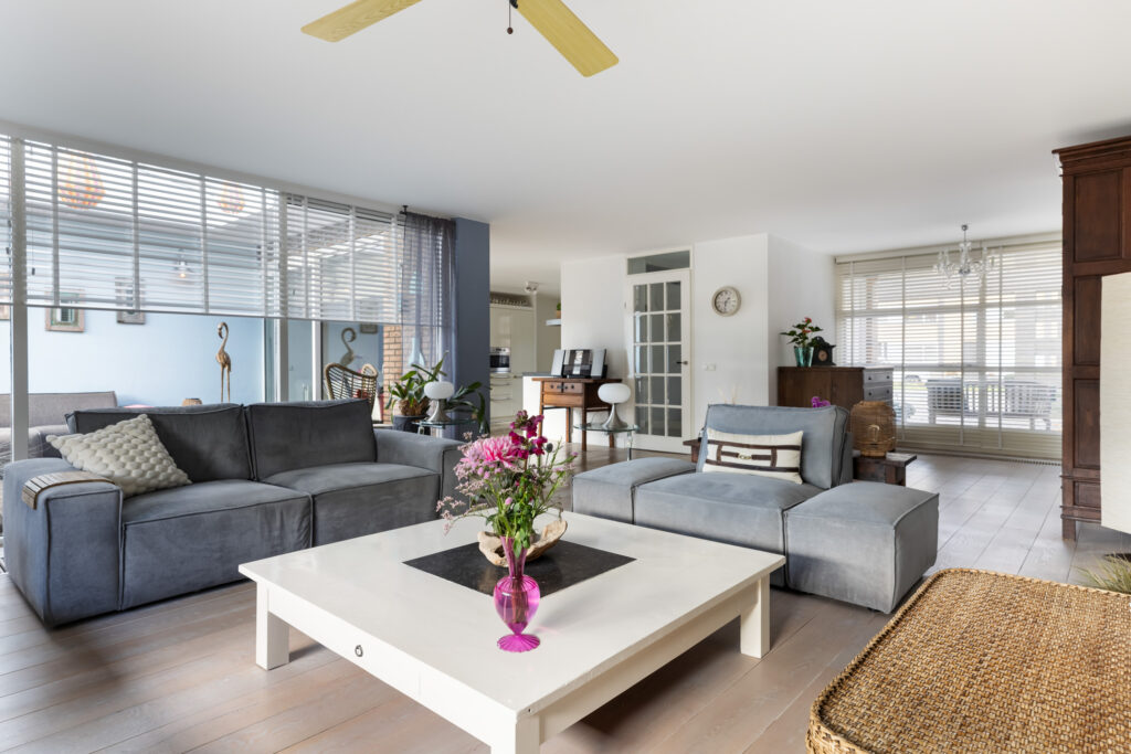 – Royale lichte woonkamer omgeven door grote raampartijen.