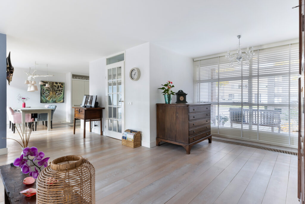 De ruim bemeten woonkamer (ca. 54m²) is dankzij de grote raampartijen aan de voor-, achter- én zijkant heerlijk licht en heeft een prettige, open sfeer. Aan de achterzijde zorgt de markies voor extra comfort op zonnige dagen. De ruimte is afgewerkt met stijlvolle houten vloerdelen en voorzien van een convectorputverwarming voor de twee grote raampartijen.